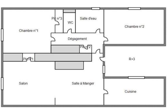 Une salle à manger et salon avec cheminée, un placard, une cuisine ouverte, un dégagement avec placard, deux chambres, wc et salle d'eau.