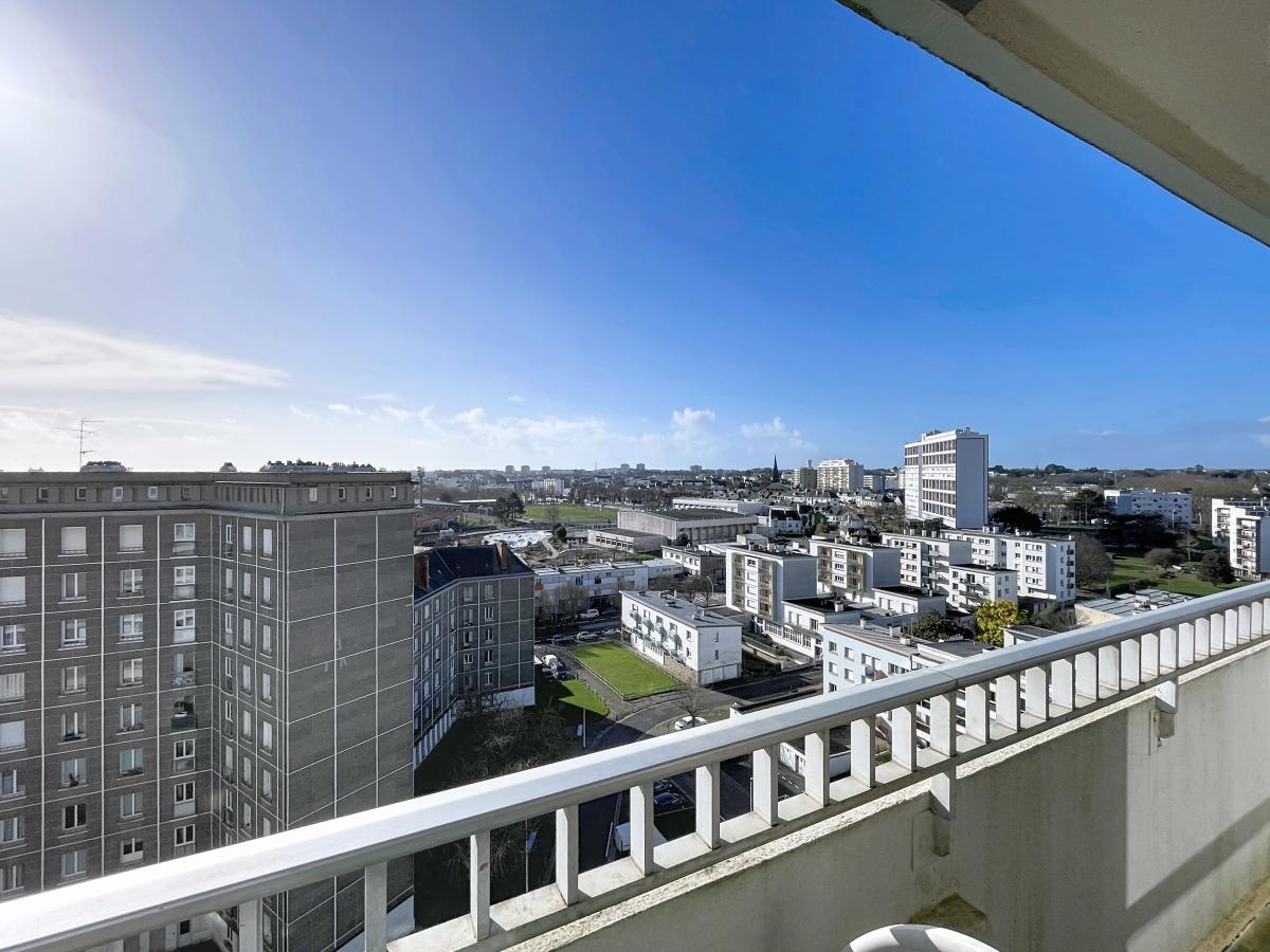CENTRE - T3 au 10è étage/11 en TBE, dans copro de 1969 : hall d'entrée avec 2 grands placards, cuisine AE ancienne avec 1 accès à une loggia fermée, séjour-salon (21 m²) baigné de lumière avec BALCON SUD jolie vue dégagée sur LORIENT, 2 chambres, salle d'eau, wc. Résidence entretenue et sécurisée (présence d'un gardien).