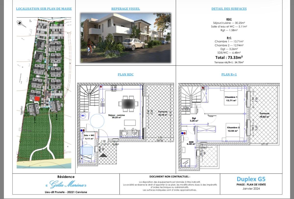 Neuf et en bord de plage. Duplex de type 3 d'une SH de 73,33m2 vendu sur plan. Il se situe à Cervione, entre mer et montagne, à une heure de Bastia et 30 mn de l'aéroport de Poretto, dans une petite résidence parfaitement intégrée. Exceptionnel, la résidence bénéficie d'un accès piéton à la plage tout en étant à proximité de toutes commodités. Il se compose en RDC d'une cuisine ouverte sur le séjour de 30,25m2 et à l'étage de deux chambres avec salle d'eau et w-c. Il bénéficie également de deux belles terrasses de 34,70m2 en tout et de deux places de stationnement. Dossier complet et visite virtuelle sur https://gilia-marina.com