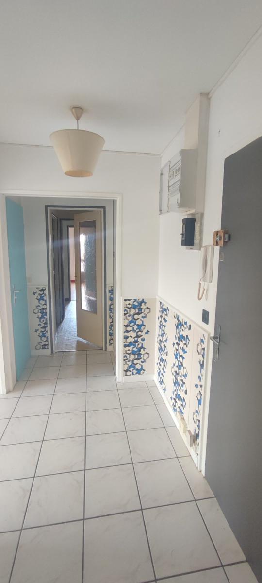 Le Mans Quartier Vauguyon, T3 avec terrasse 15 m², comprenant: entrée et dégagement avec placard, séjour avec accès à la terrasse, cuisine, espace buanderie, salle de bains, WC, deux chambres.