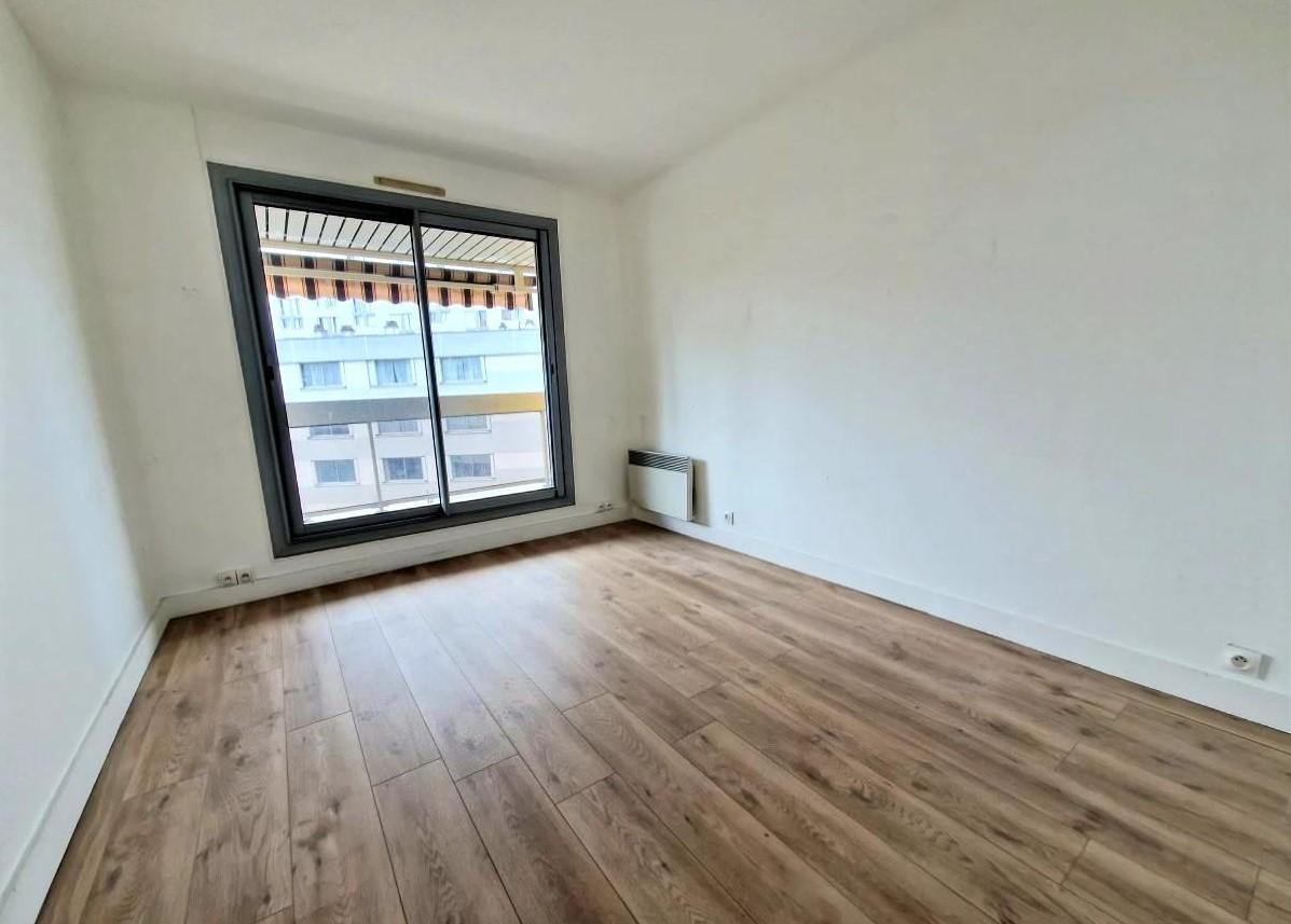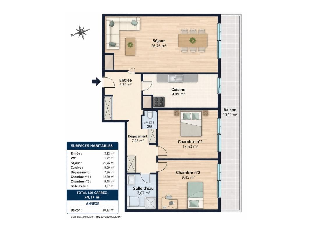 La distribution : un salon-séjour, une cuisine fermée, deux chambres, une salle d’eau et un WC séparé, avec un balcon filant exposé sud-ouest.