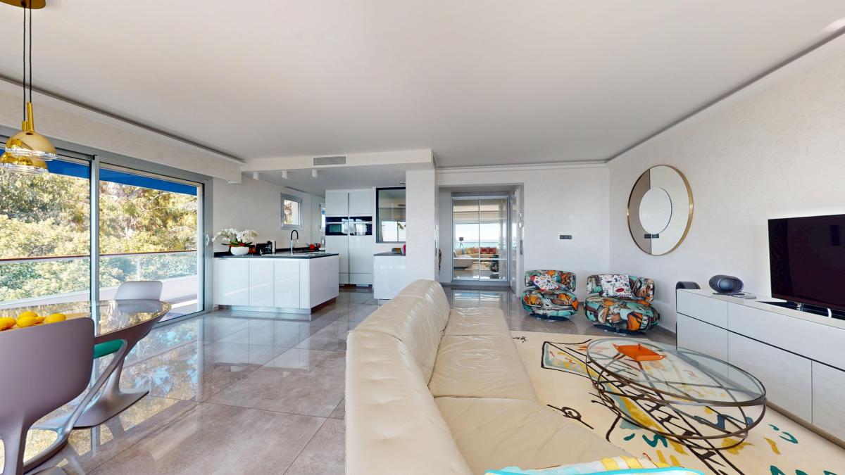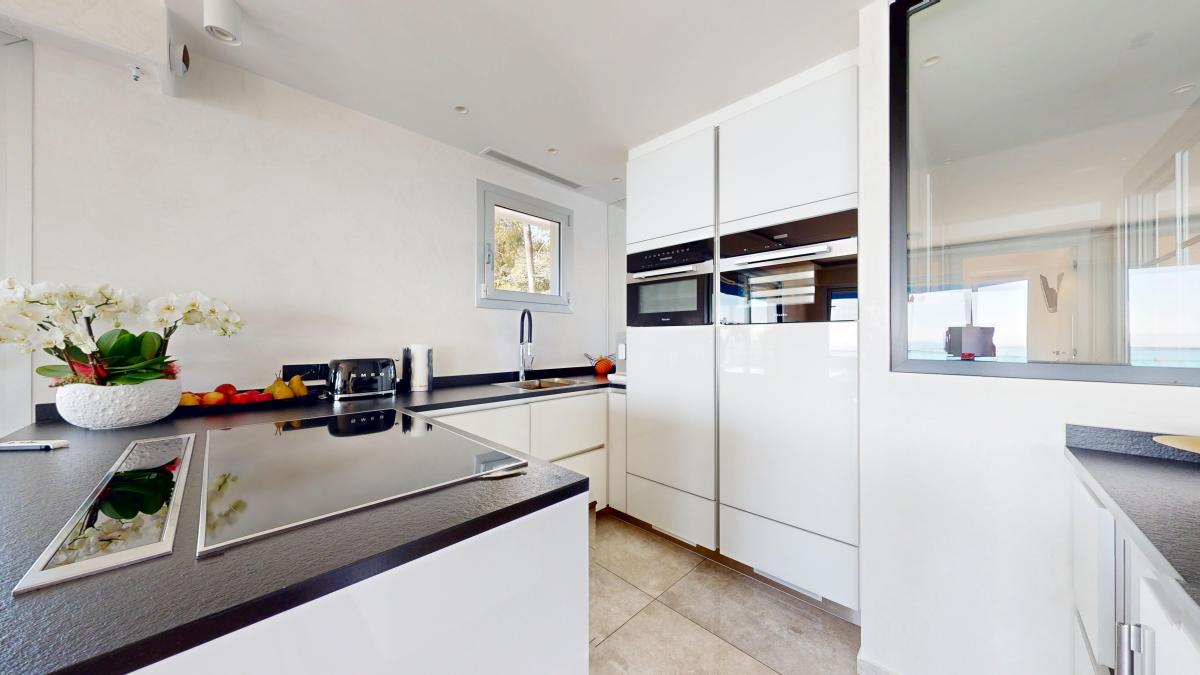 L’espace de réception, aux volumes généreux, s’organise autour d’un séjour prolongé par une terrasse circulaire d'environ 30 m², offrant une exposition optimale et une vue ouverte sur la mer. La cuisine, intégrée avec discrétion, est équipée d’éléments contemporains et s’inscrit harmonieusement dans l’ensemble.