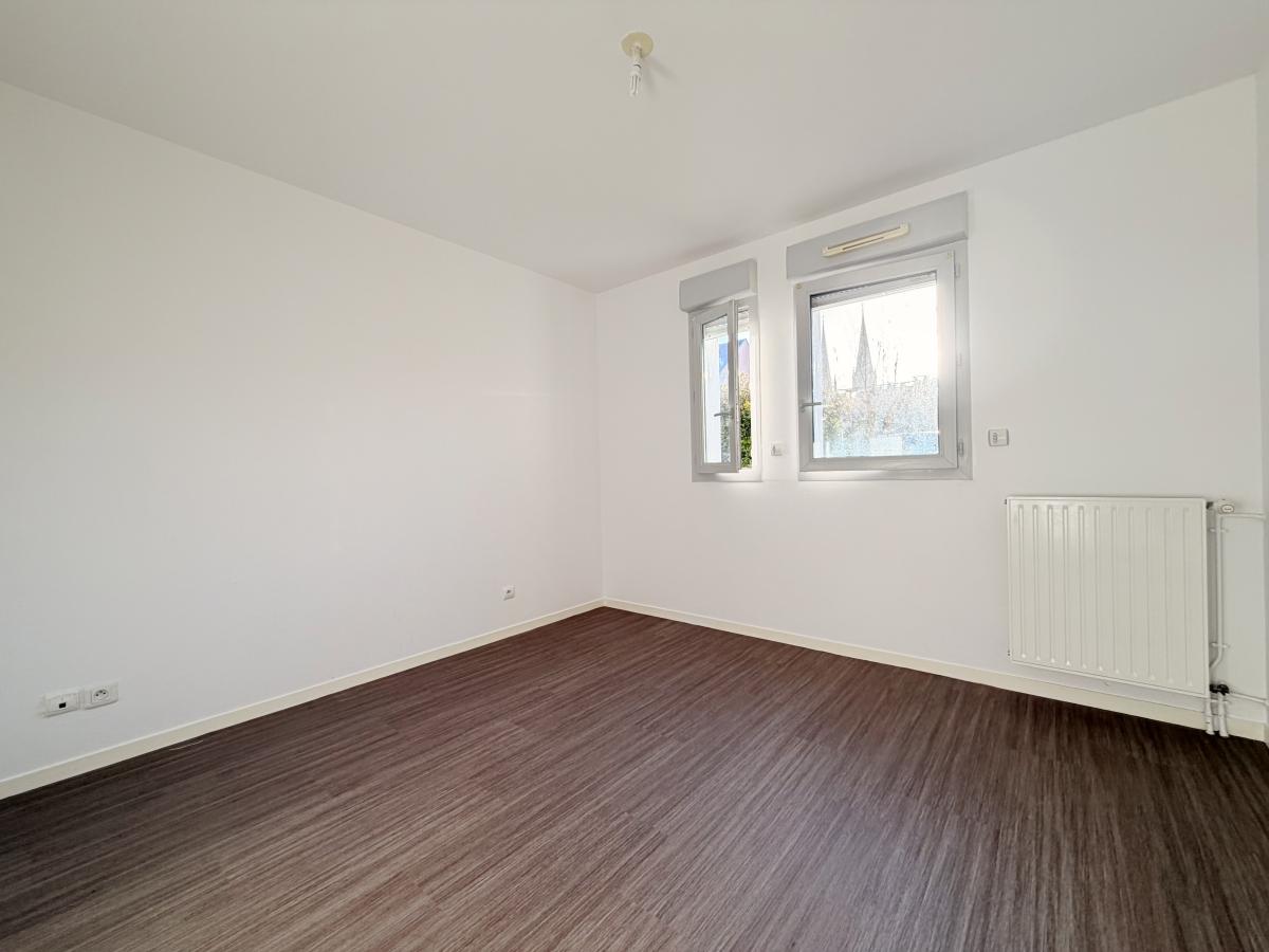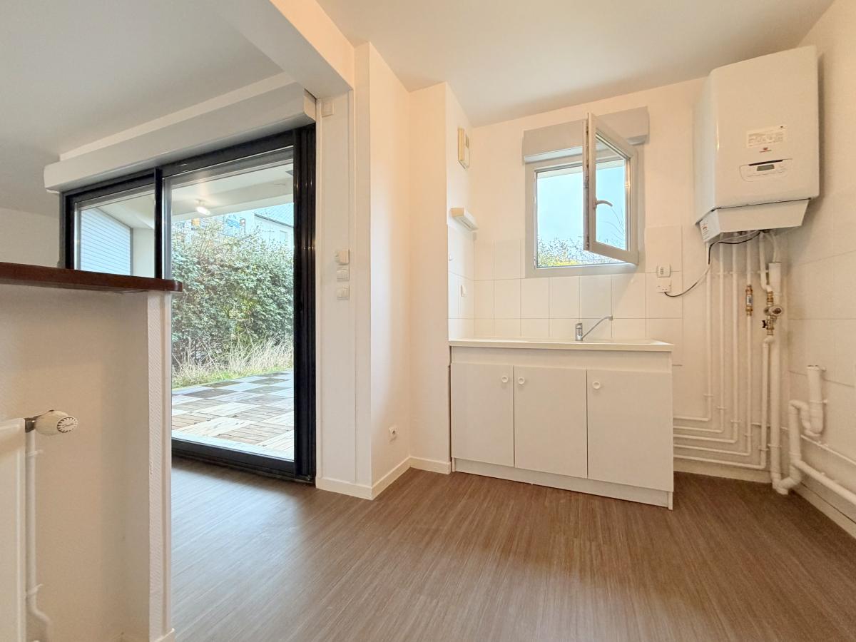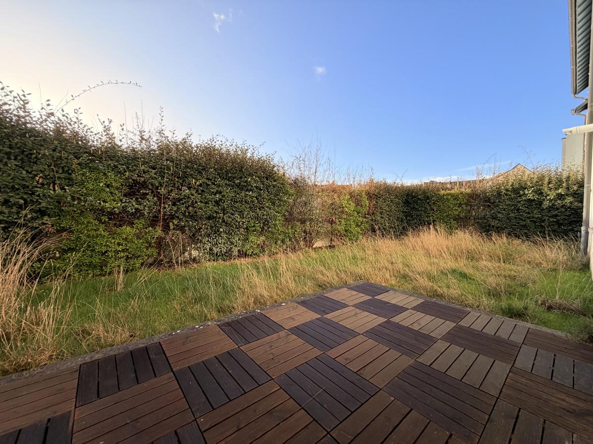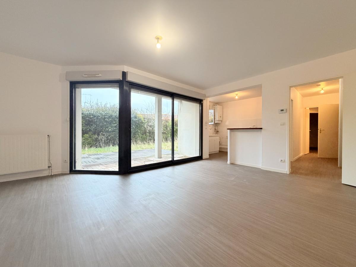 Centre ville de Douvres, dans un immeuble récent, appartement F3 de 82 m² situé en rez-de-jardin, comprenant entrée avec placard, cuisine, séjour-salon avec accès jardin privatif, dégagement, wc, dressing, salle de bains, deux chambres. Une cave. Deux parkings.