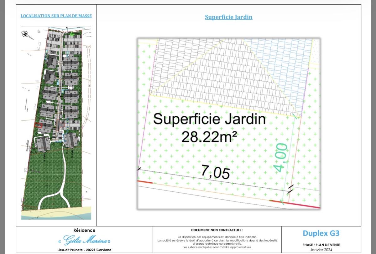 Neuf et en bord de plage. Duplex de type 3 d'une SH de 83,17m2 avec terrasses et jardin vendu sur plan. Il se situe à Cervione, entre mer et montagne, à une heure de Bastia et 30 mn de l'aéroport de Poretto, dans une petite résidence parfaitement intégrée. Exceptionnel, la résidence bénéficie d'un accès piéton à la plage tout en étant à proximité de toutes commodités. Il se compose en RDC d'une cuisine ouverte sur le séjour de 37,19m2 et à l'étage de deux chambres avec salle d'eau et w-c. Il bénéficie également de deux belles terrasses de 34,78m2 en tout, d'un petit jardin privatif de 28,22m2 et de deux places de stationnement. Dossier complet et visite virtuelle sur https://gilia-marina.com