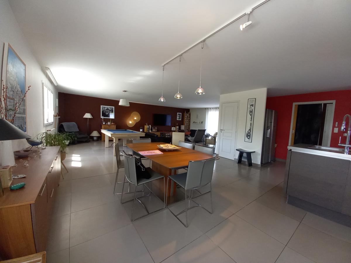 Un premier niveau comprenant une entrée, une vaste pièce de vie de plus de 90 m² avec cuisine équipée/aménagée ouverte, un WC et l’accès direct au premier garage en sous-sol.