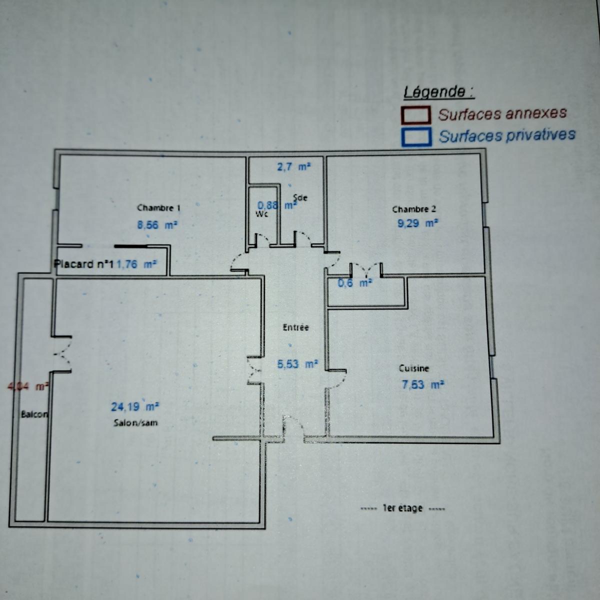 Appartement lumineux, d'une surface de 61.04 m² Loi CARREZ situé au 1er étage.