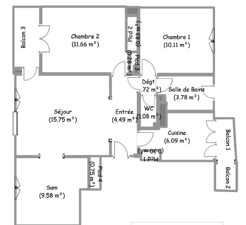 Il comprend une entrée de 4.49m², cuisine de 6.09m² avec accès au balcon, salon-salle à manger de 25.33m² avec placard et accès au balcon, 2 chambres de 10.11m² et 11.66m² dont une donnant sur un balcon, salle de bains de 3.76m², WC séparés.