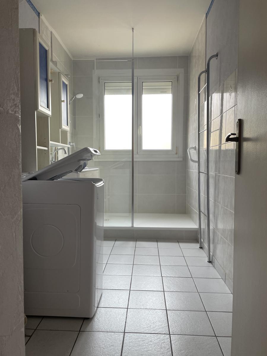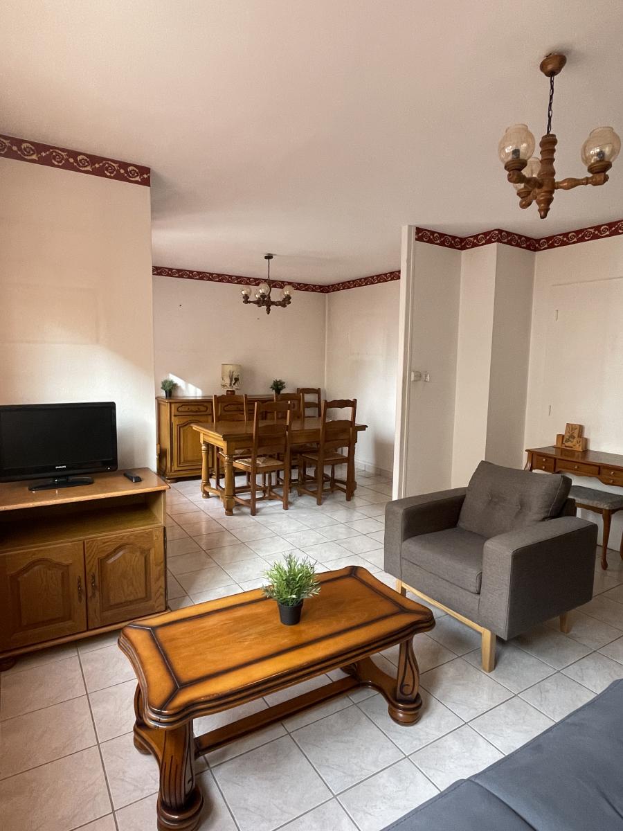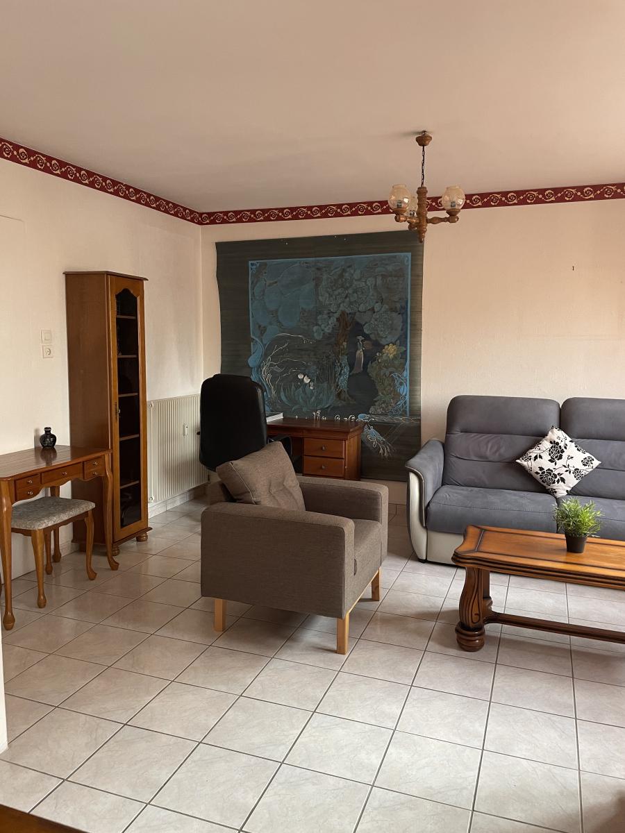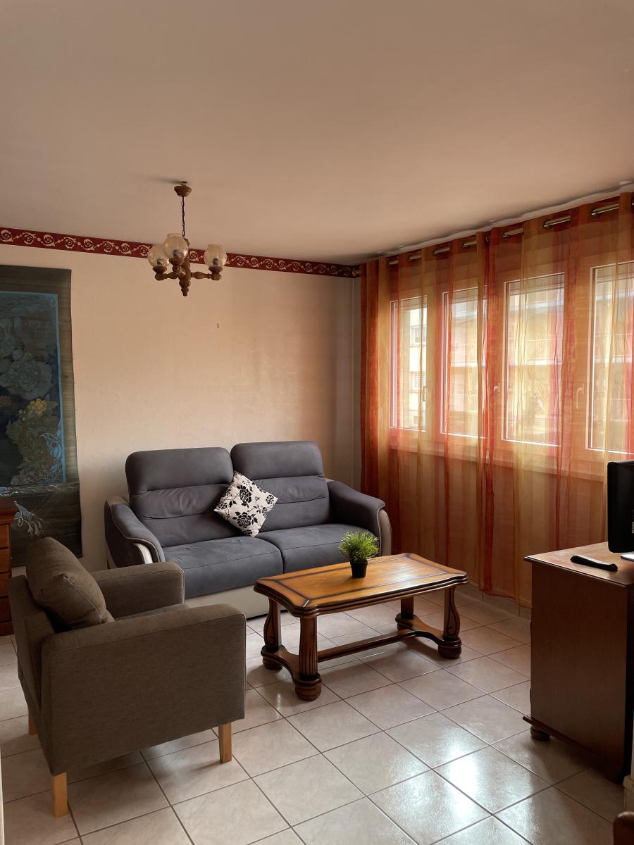 Appartement de type f4 en rez-de-chaussée surélevé composé d'une entrée, un salon/séjour double donnant sur un balcon, une cuisine équipée avec balcon, deux chambres, une salle de bains récente et un débarra. Une cave privative. Double vitrage avec volets roulants électriques