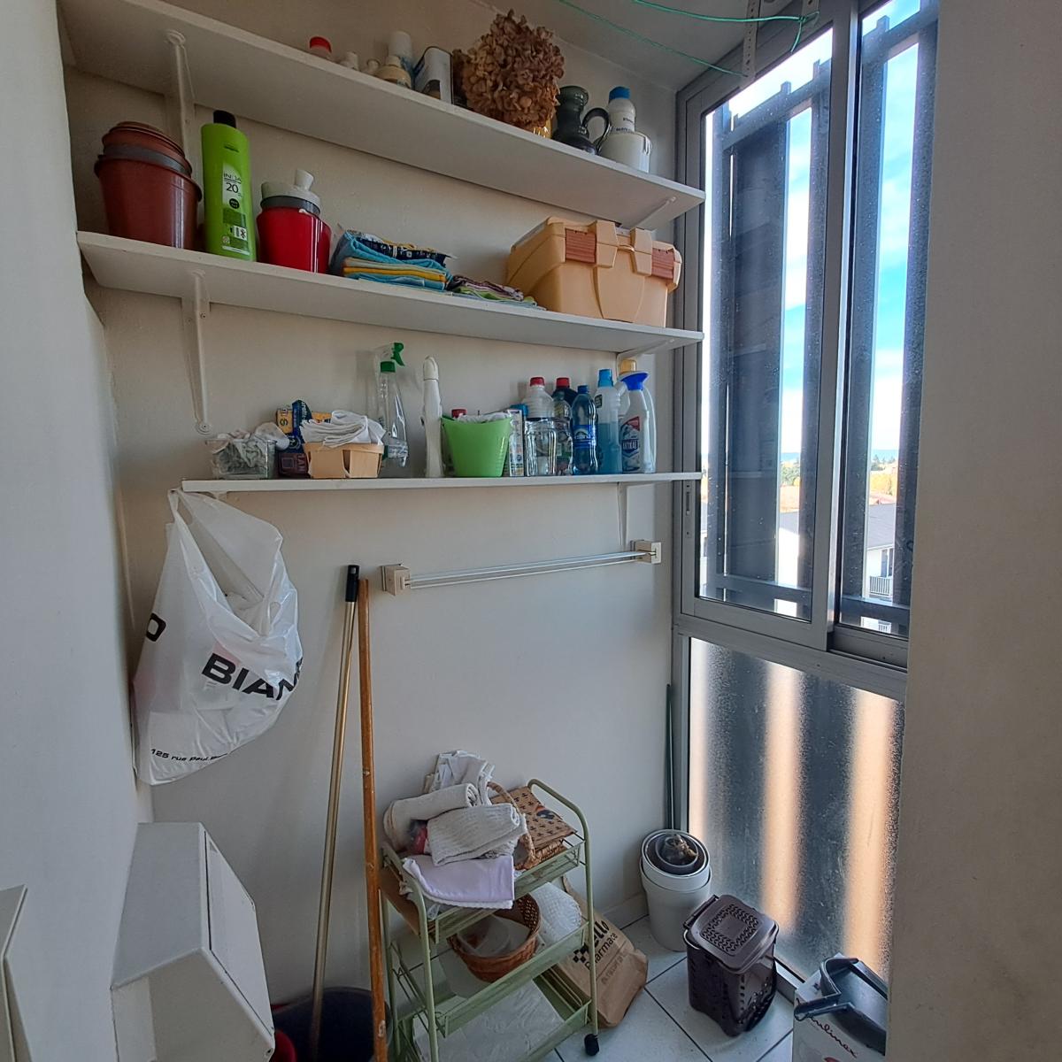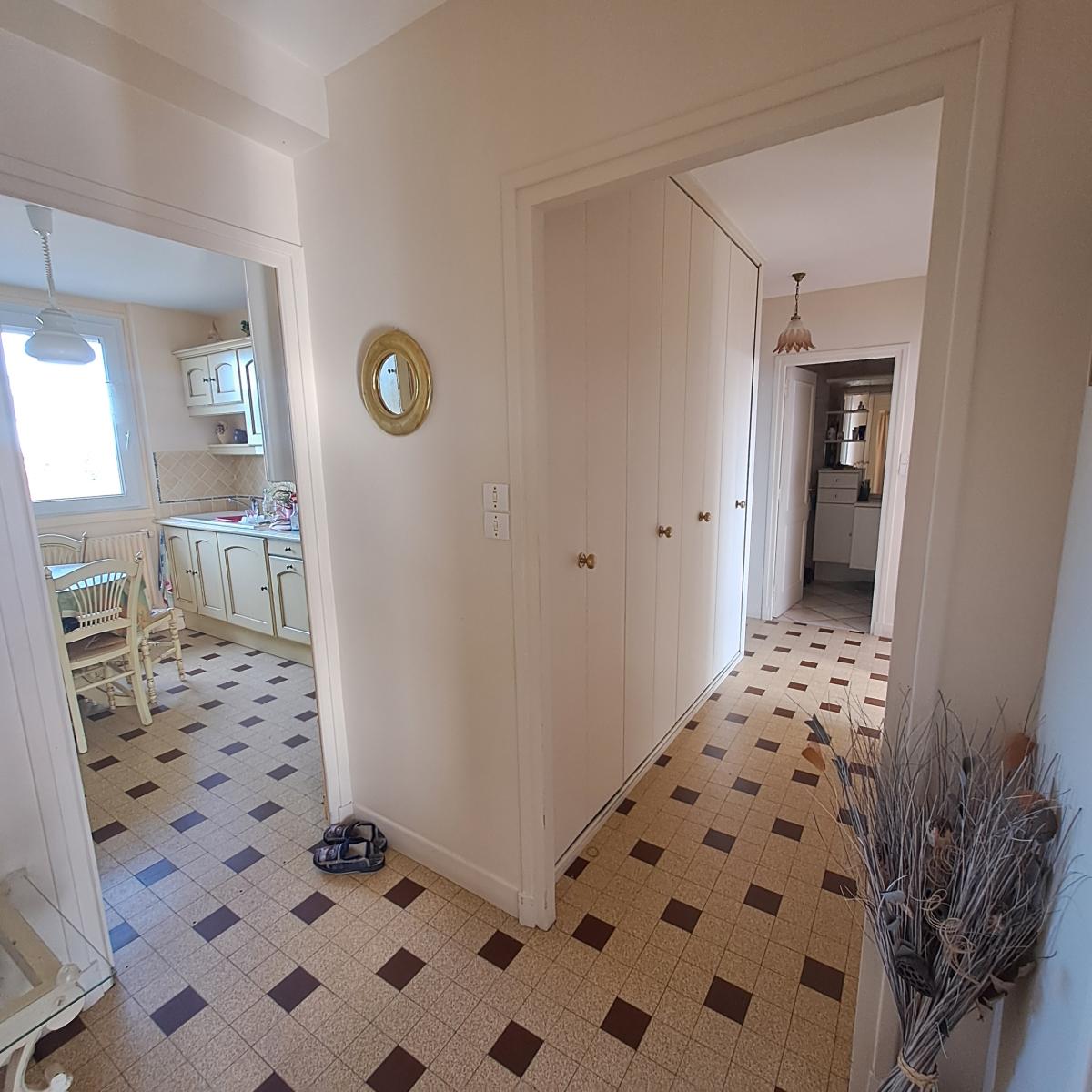 un hall d'entrée, salon/séjour, cuisine avec accès à la loggia (1.44m²), salle de bains, w.c, 2 chambres et grand placard dans le couloir.