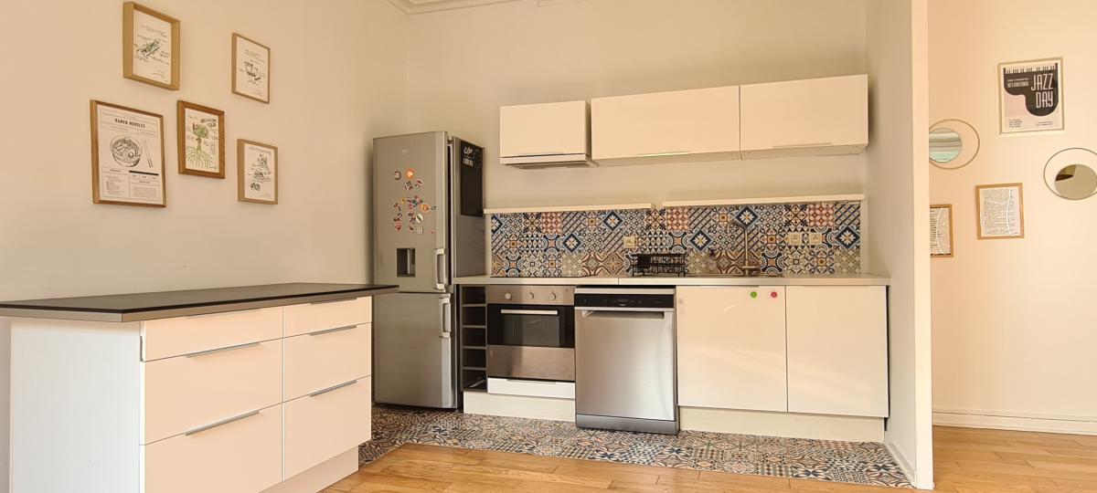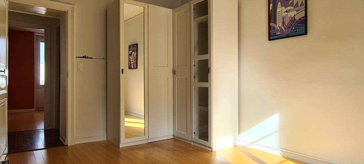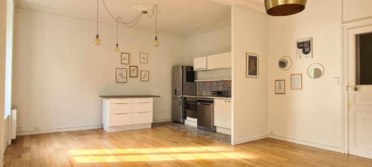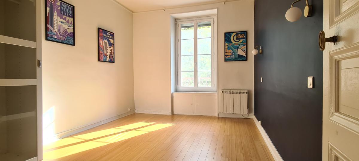 Il se compose d'une vaste entrée avec rangement, d'un salon-séjour de plus de 30 m² et sa cuisine aménagée et équipée, d'un dégagement, de deux chambres (avec rangements ou placards), d'une salle d'eau et d'un toilette indépendant.