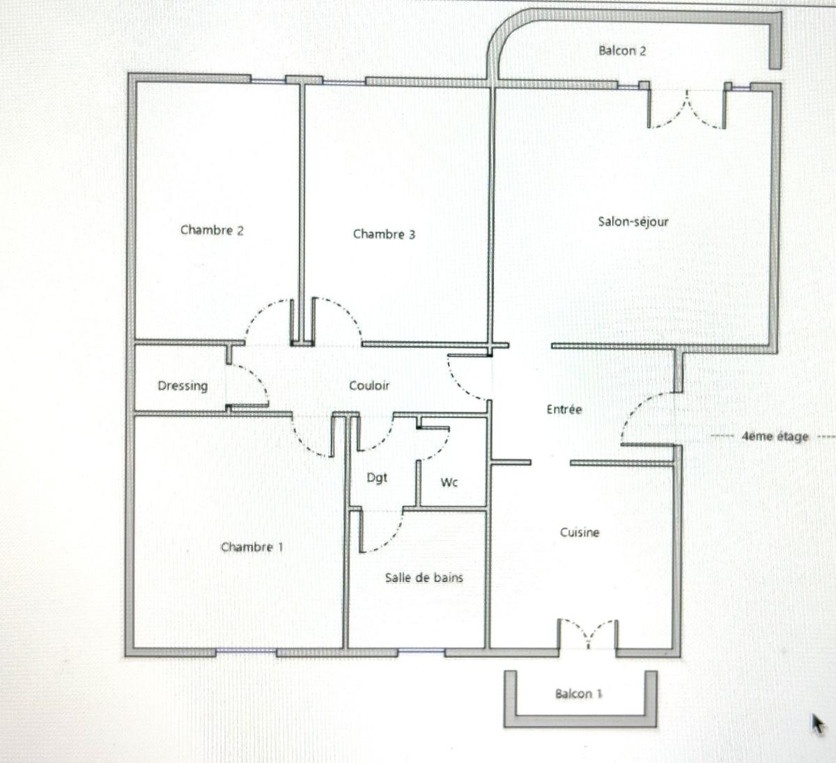 L'appartement dispose d'une cuisine équipée avec balcon , une pièce de vie disposant également d'un balcon , de trois chambres et d'une salle de bains ( toilettes séparées ) plus un dressing.