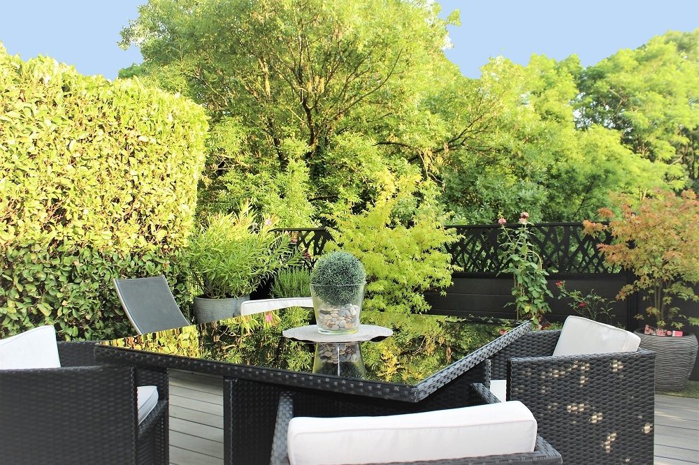 Au rez-de-jardin, une jolie pièce cuisine équipée ouverte sur le séjour de 38m² donnant accès à la belle terrasse aménagée d'environ 30m², sans vis à vis, exposée Sud-Ouest, en limite des prés et des bois.