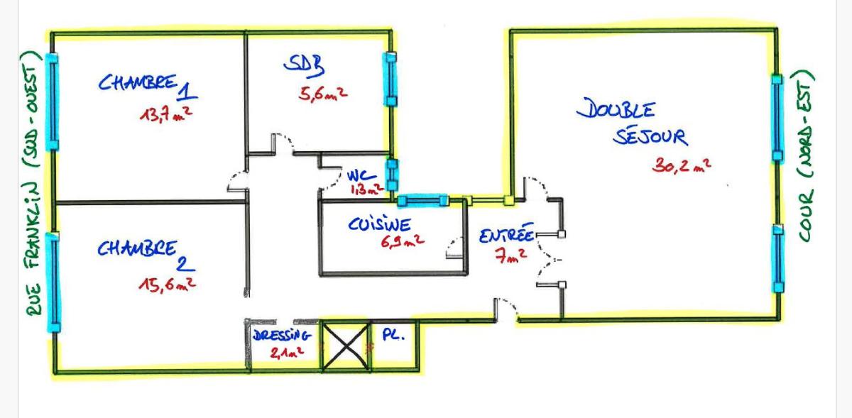Exclusivité. Au cœur de Bécon Les Bruyères, rue Franklin. Au sein d'un charmant immeuble des années 30 parfaitement entretenu avec Gardien. Un bel appartement familial traversant de 4 pièces principales de 90,32m² au sol (89,67m² loi Carrez) au 3ème étage AVEC ascenseur. Baigné de lumière, il est composé d'une entrée, double-séjour (30m²), cuisine indépendante, 2 chambres de 14m² et 15m² (possibilité 3ème), dressing, WC séparés et salle de bains. Fenêtres dans toutes les pièces.