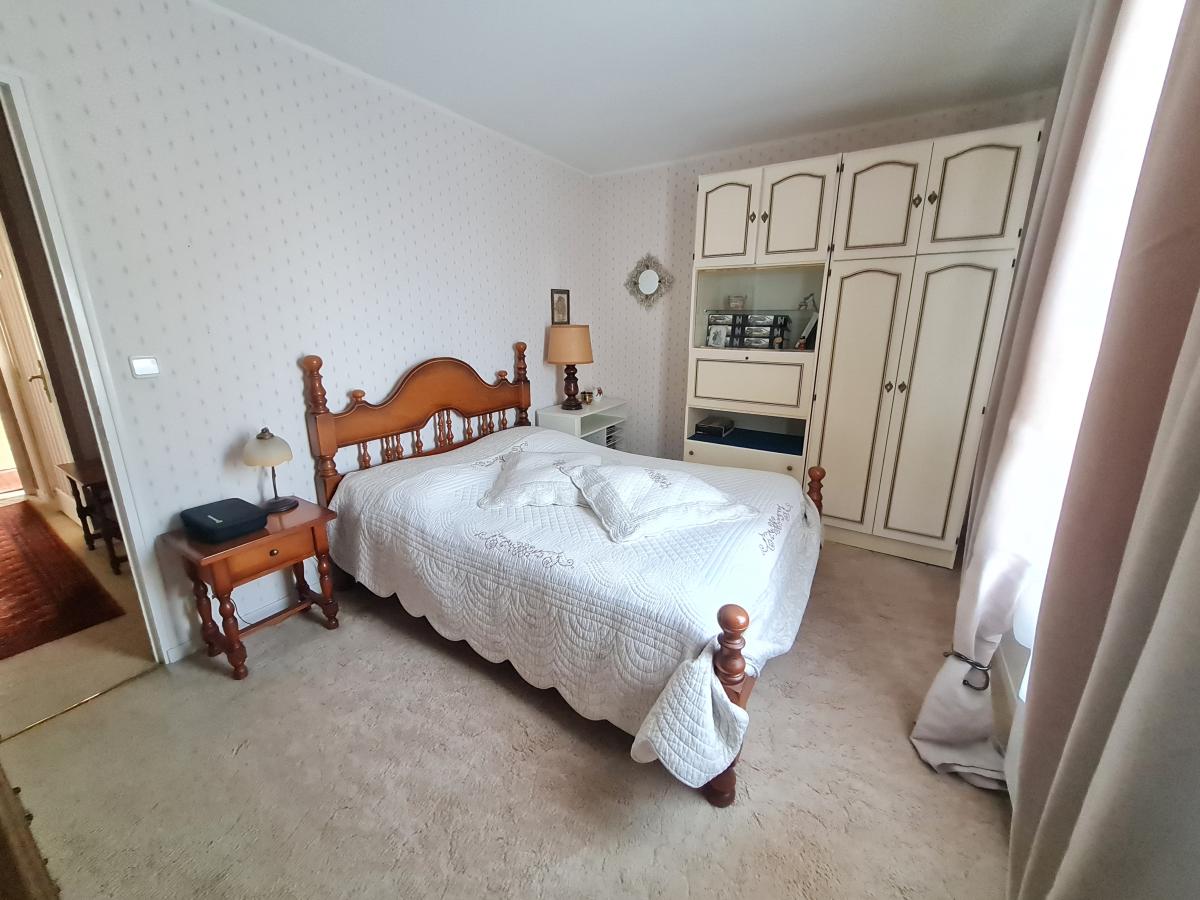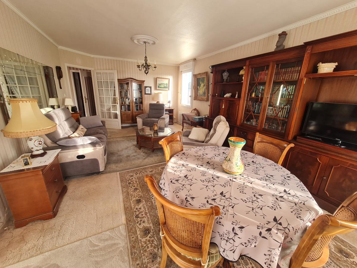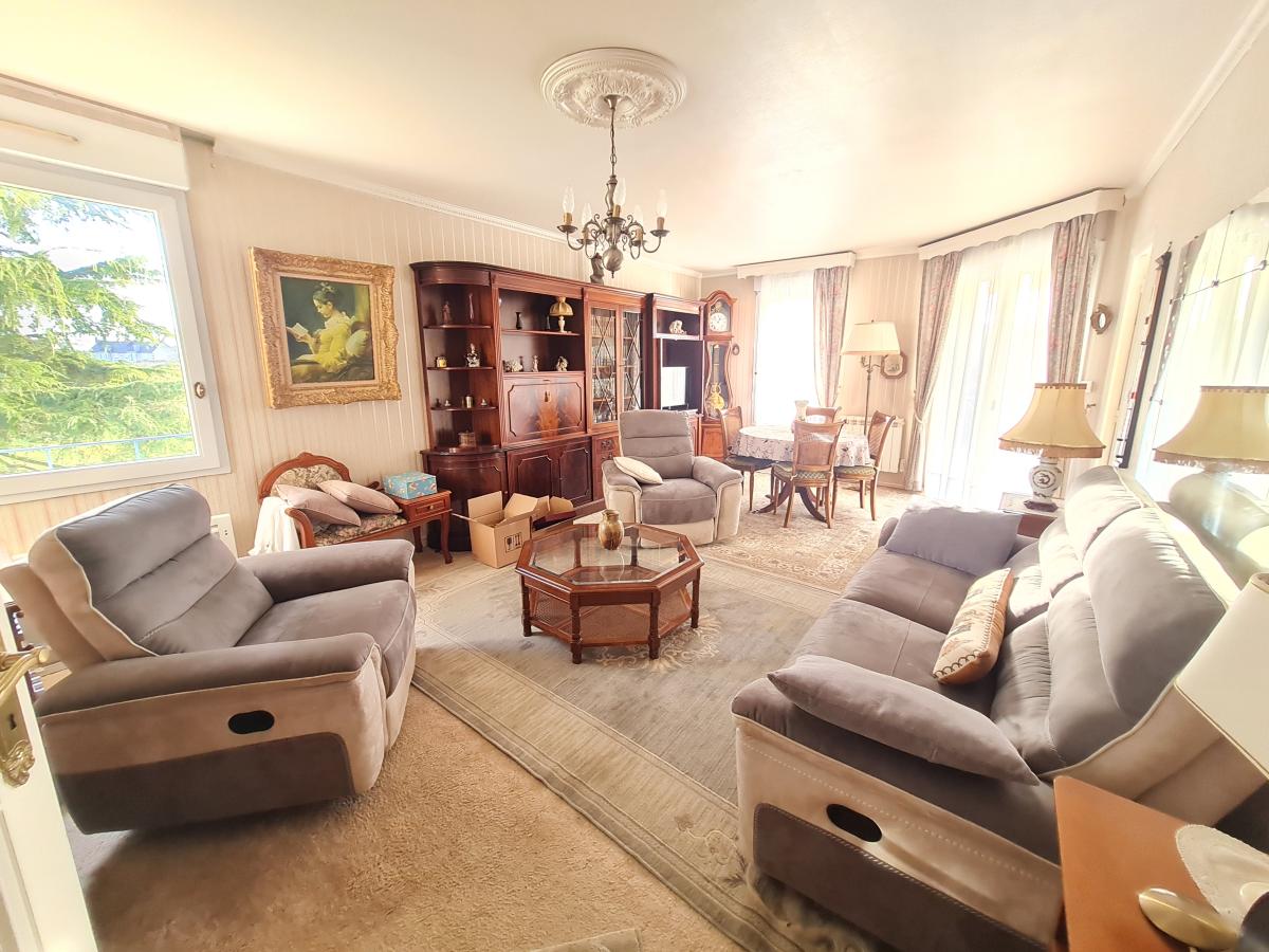 Appartement au 1er étage avec ascenseur, comprenant: entrée dans couloir avec placard, arrière-cuisine, cuisine aménagée et équipée (éléments hauts et bas, évier 2 bacs, four, 4 feux électriques hotte), terrasse, salon/ séjour, couloir, WC avec lave-main, salle de bains (baignoire, meuble vasque), deux chambres, bureau.