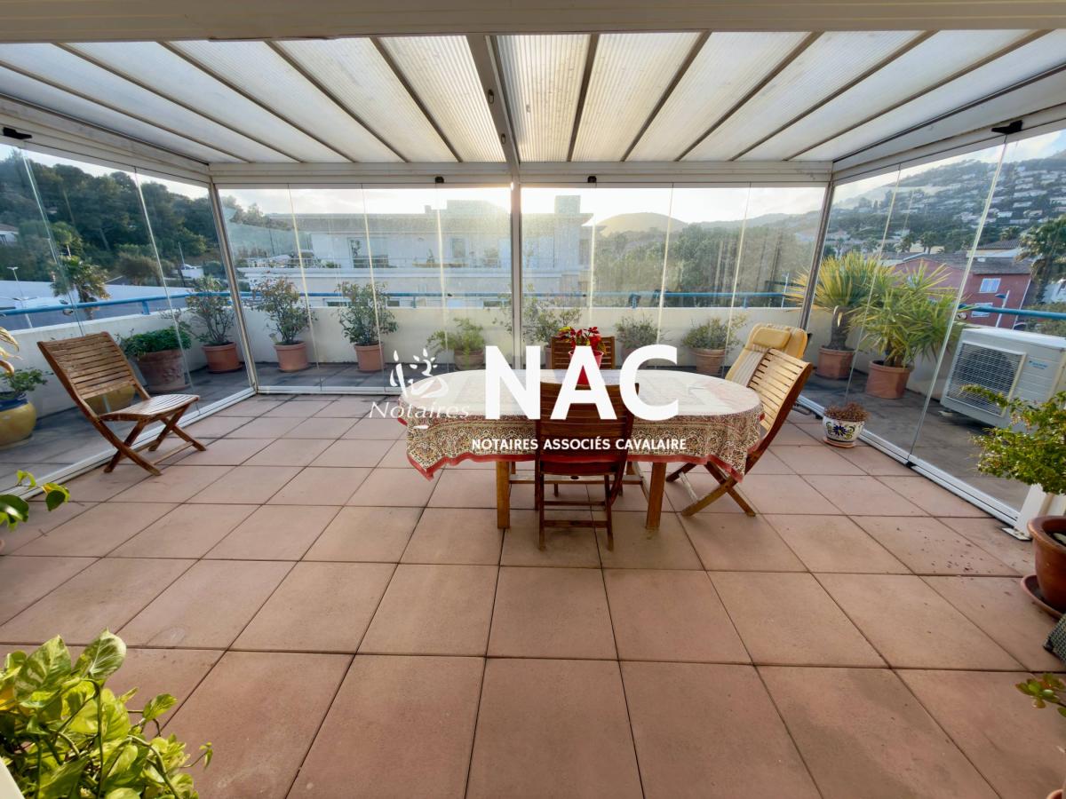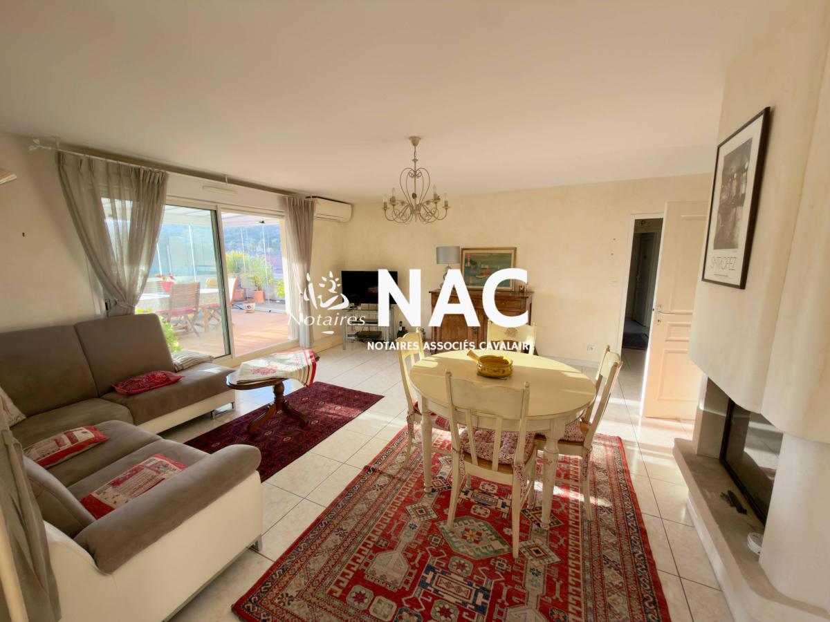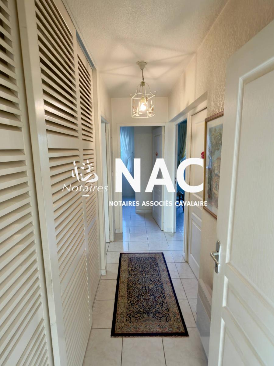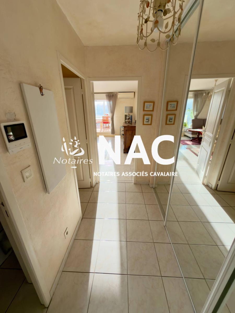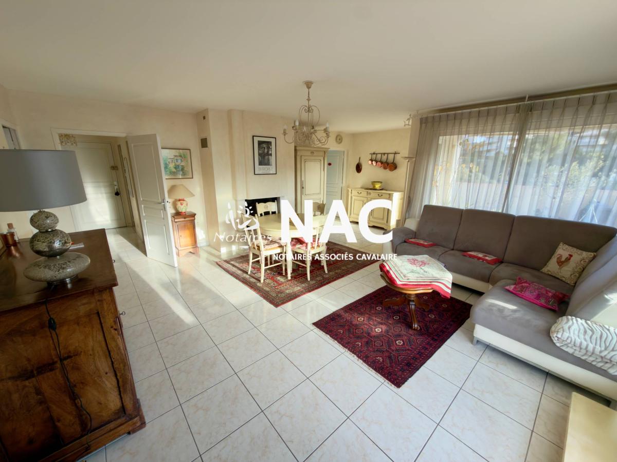 CAVALAIRE SUR MER - CENTRE-VILLE À PIEDS - À vendre, appartement 4 pièces de 97m² situé au 4ᵉ et dernier étage d’une résidence sécurisée. Il comprend une entrée avec placard, WC invités, salle de douches, séjour / salle à manger d’environ 31 m² avec cheminée, cuisine indépendante équipée, 3 chambres avec placards, salle de bains avec WC.