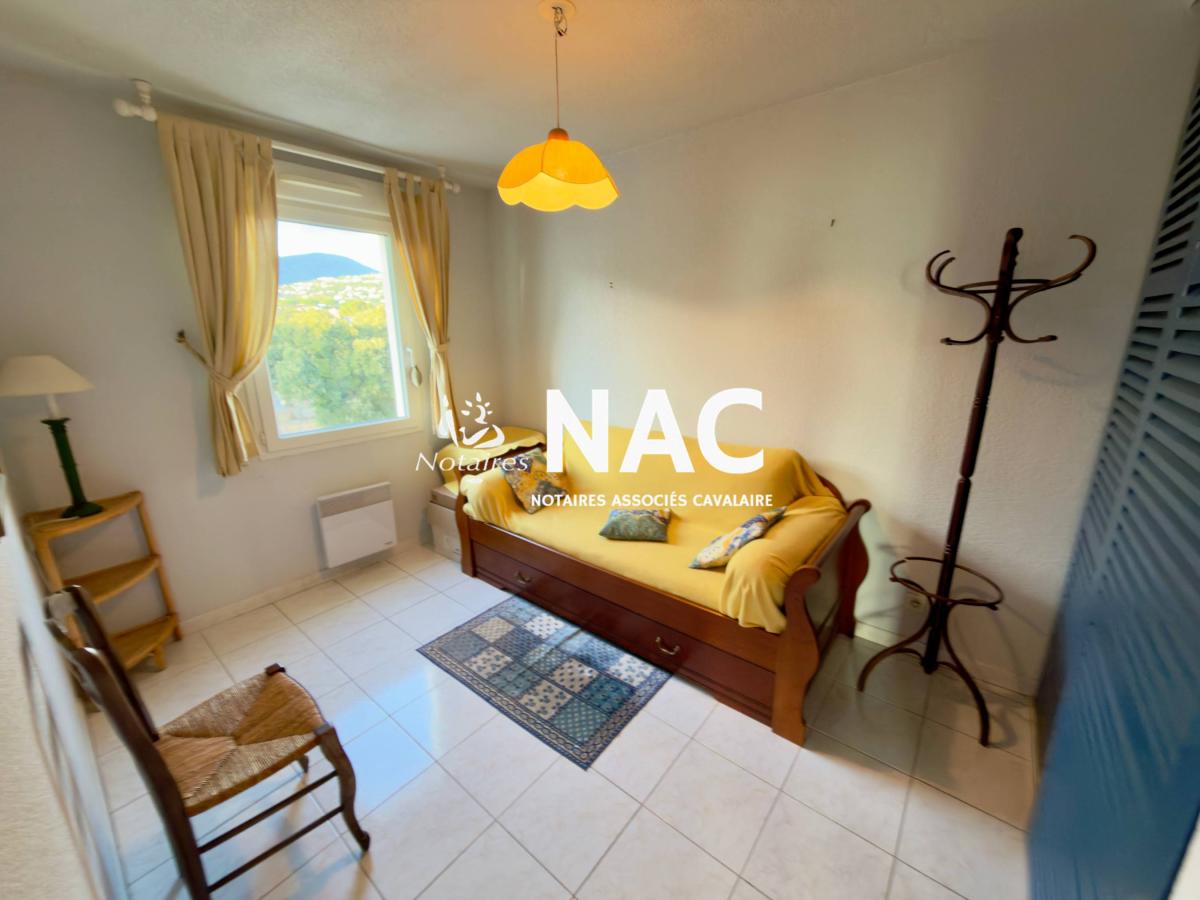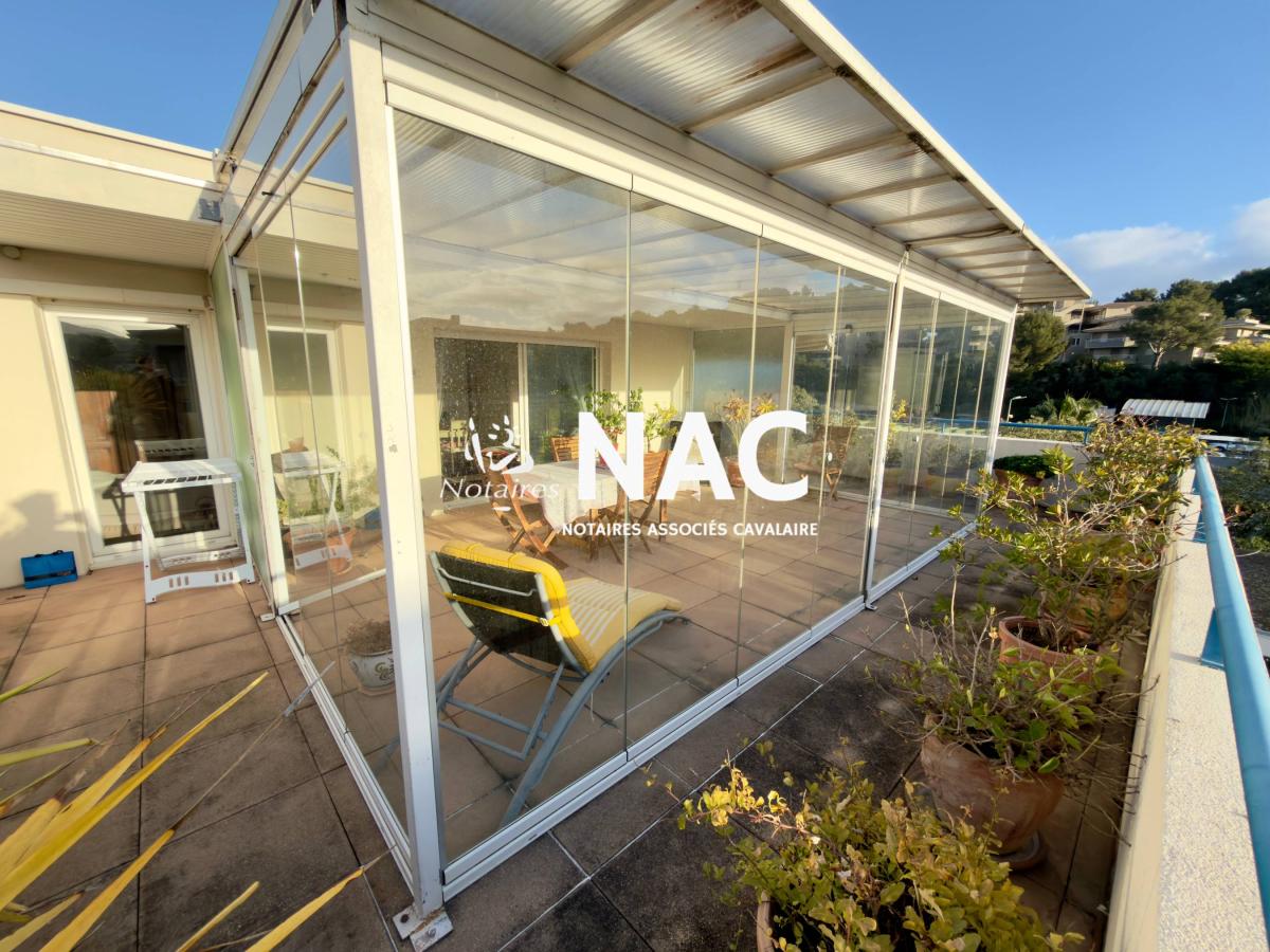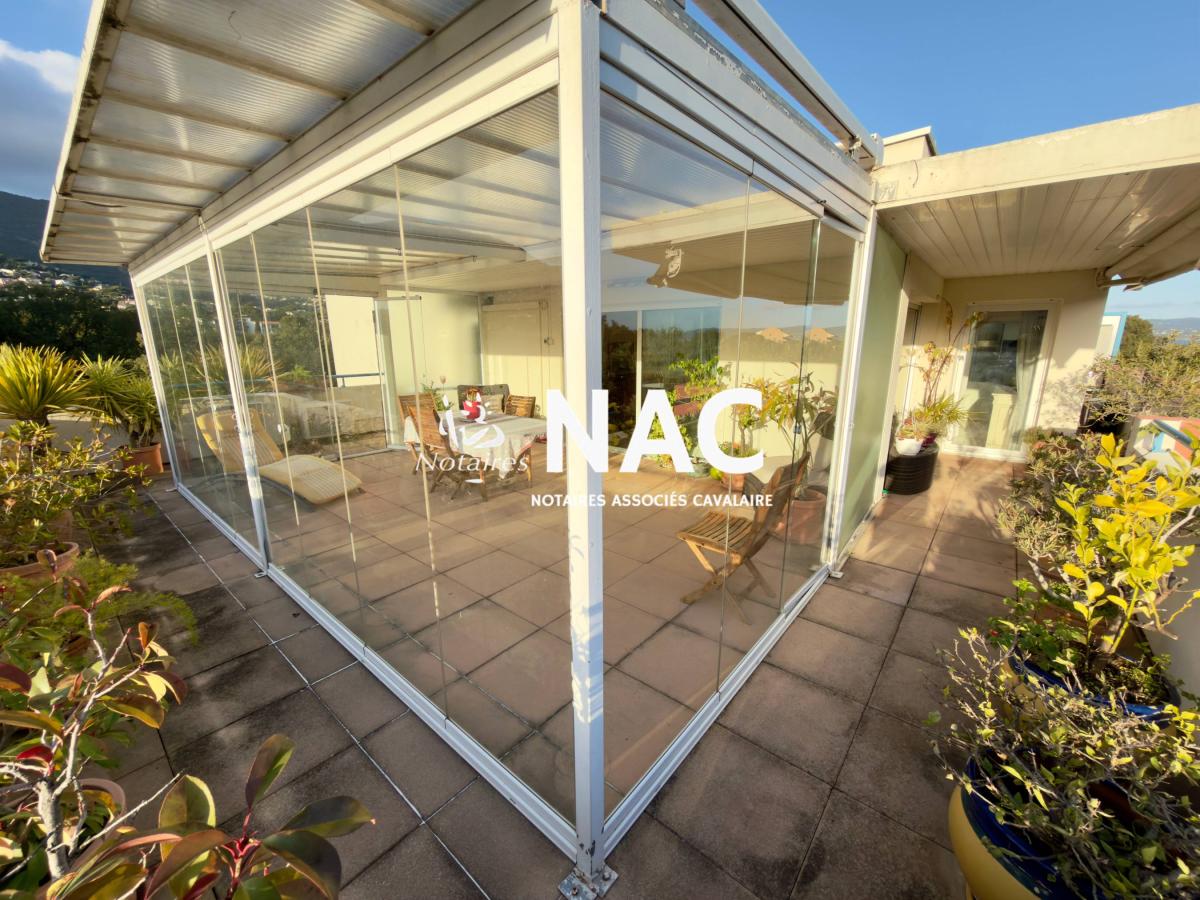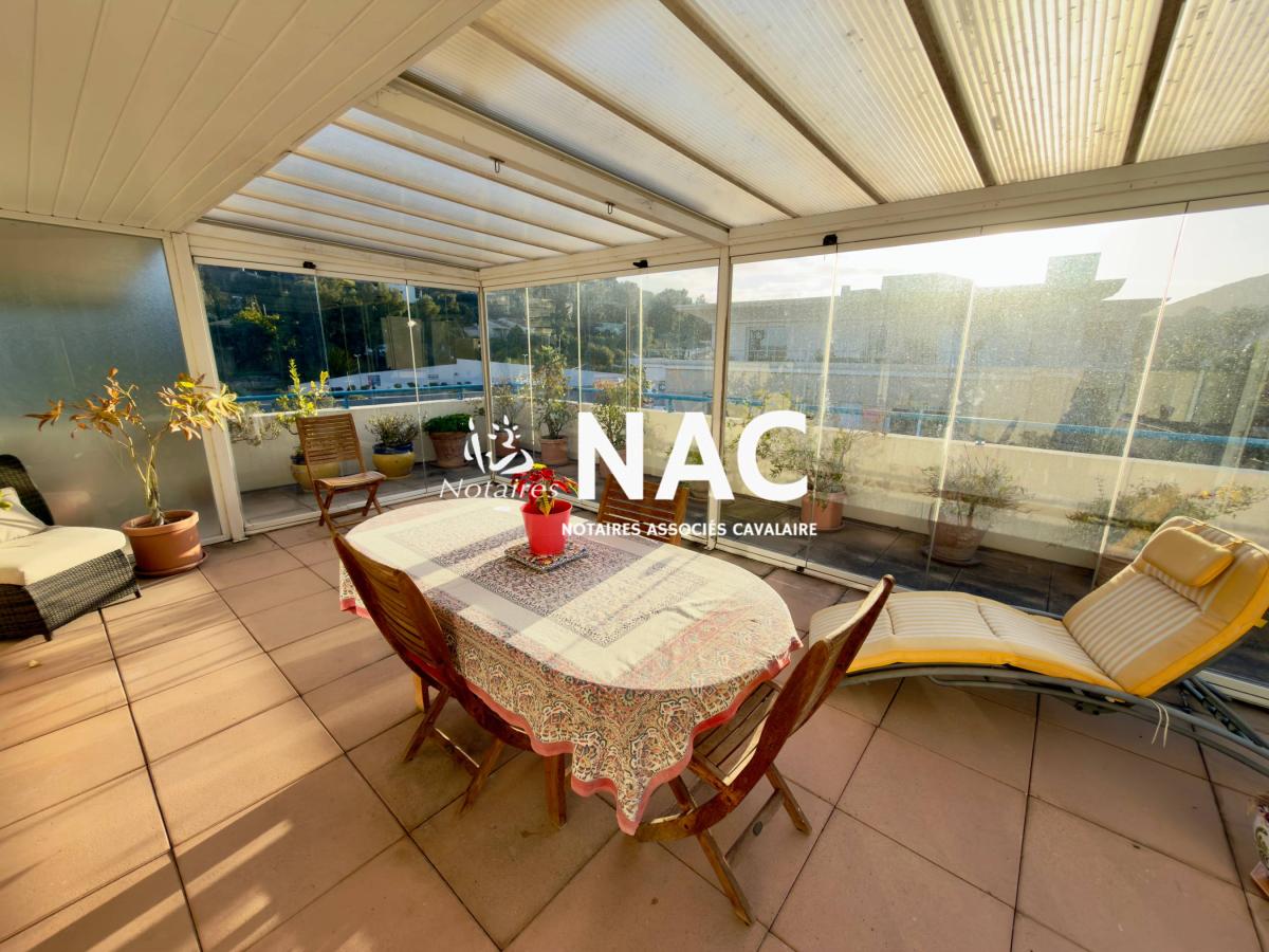 CAVALAIRE SUR MER - CENTRE-VILLE À PIEDS - À vendre, appartement 4 pièces de 97m² situé au 4ᵉ et dernier étage d’une résidence sécurisée. Il comprend une entrée avec placard, WC invités, salle de douches, séjour / salle à manger d’environ 31 m² avec cheminée, cuisine indépendante équipée, 3 chambres avec placards, salle de bains avec WC.