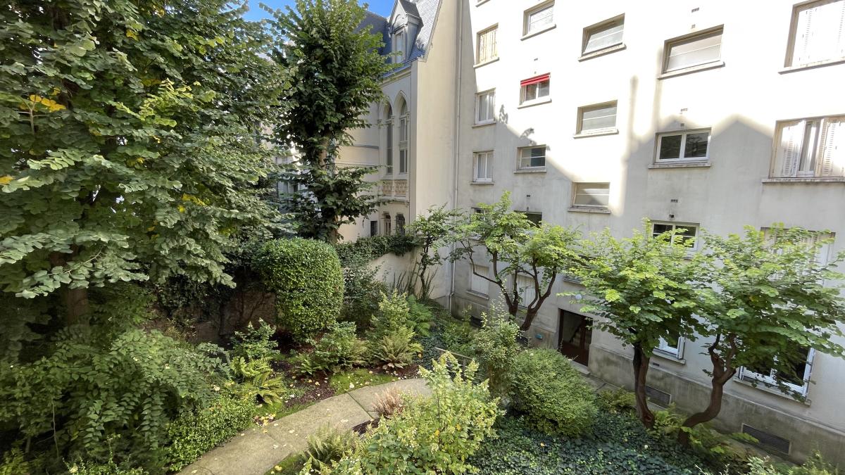 Traversant, il donne sur la rue avec un vis-à-vis lointain et sur une cour arborée. Parquet chêne.