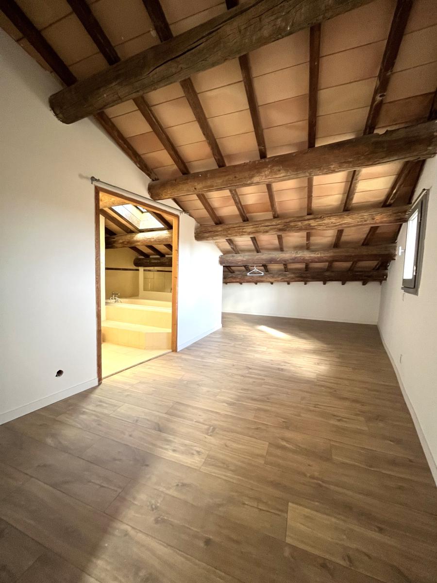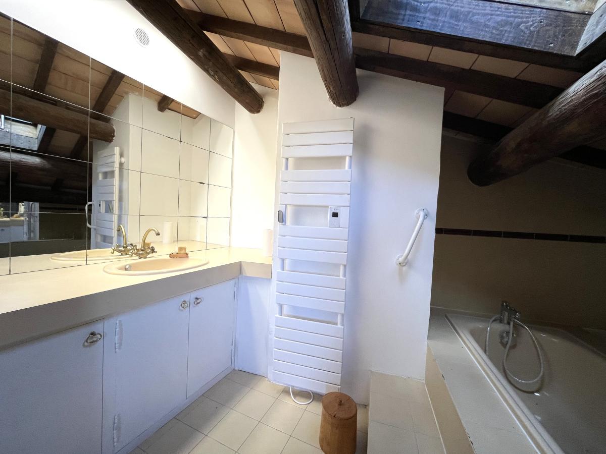 La charpente apparente et la double hauteur sous plafond confèrent à cet appartement un cachet unique et une authenticité de l’ancien.