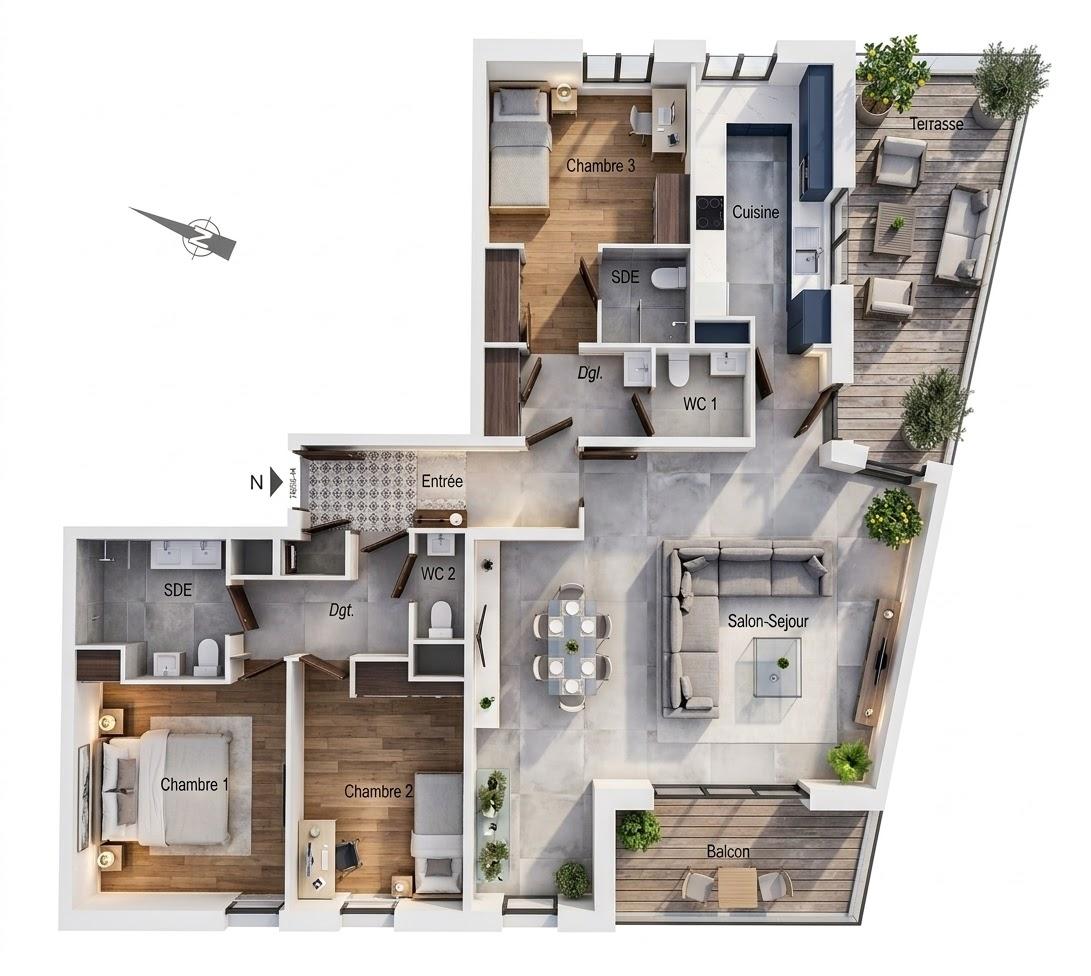 Hall d'Entrée avec rangements, Séjour-salon de 43M² avec Terrasse Plein Sud et Balcon exposé Ouest, Cuisine aménagée et équipée, Chambre