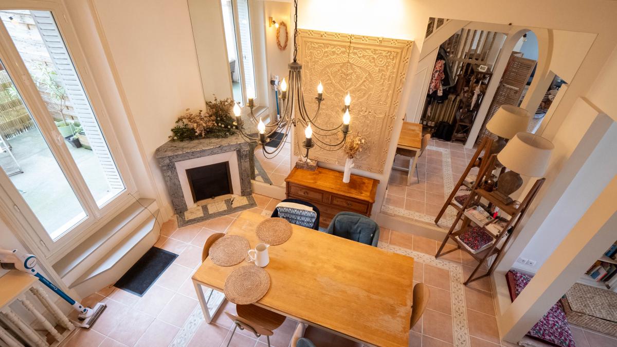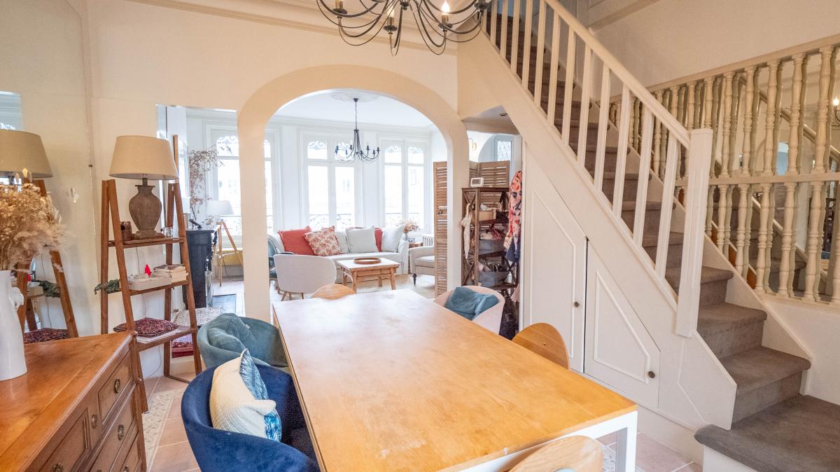 Exclusivité. En centre-ville. Au sein d'un petit immeuble bourgeois de style Anglo-Normand (1898) de caractère. Bien entretenu, dans un environnement calme et verdoyant. Un magnifique appartement traversant (Est-Ouest) en Duplex de 5 pièces principales de 113,49m² loi Carrez (116,71m² au sol) aux 1er & 2ème étages sans ascenseur. Baigné de lumière, il est composé d'une belle entrée sur vaste séjour avec cheminée (accès balcon) et bureau. Salle à manger et cuisine avec accès à une jolie Terrasse au calme sur jardin (9,4m²). Cuisine séparée et WC indépendants. Au second niveau suite parentale avec SDE attenante (20m²), grande salle de bains et 2 autres chambres confortables (12,3m² & 14,6m².