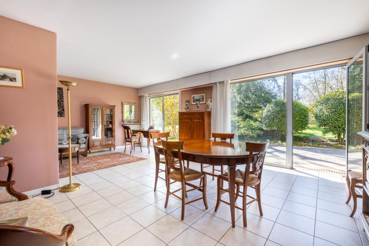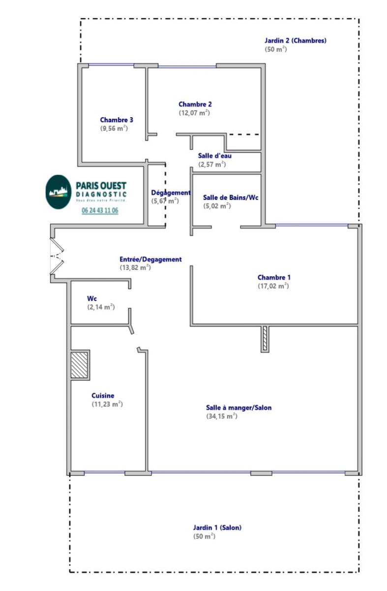 Sur les hauteurs de Versailles, à proximité du Quartier Glagny-Glatigny et de ses forêts, le Haras de Jardy et l’accès vers l’A13, dans une résidence des années 70 en très bon état, un appartement de 113,25m2 Carrez, situé au calme en rez de jardin, avec 100m2 d'extérieurs. Accessible depuis des parties communes très bien entretenues (jardin et hall d’entrée) cet appartement bénéficie d’une double orientation au sud coté séjour avec un espace extérieur, et au nord coté chambres avec un autre espace extérieur. Une entrée ouvre sur un double séjour de près de 35m2, prolongé par le jardin de 50m2 avec terrasse, une cuisine attenante de 11m2 et un wc séparé. La partie nuit est composée d’une première chambre de 17m2 avec accès jardin et salle de bains attenante avec wc, de 2 autres chambres (9,56m2 et 12,07m2) avec accès jardin également (50m2), une salle de douche et des dressings. Appartement en état d’usage, double vitrage, chauffage collectif par l’immeuble, volets roulants. Hauteur sous plafond : 2.55m. Charges de copropriété : 1940€/trimestre env. Taxe foncière 2024 : 2.446€. DPE : D - Local poussettes. Copropriété bien entretenue, façades et parties communes intérieures en très bon état. Au sous-sol, une cave et deux emplacements de stationnement. Commerces, écoles et transports à proximité (bus).