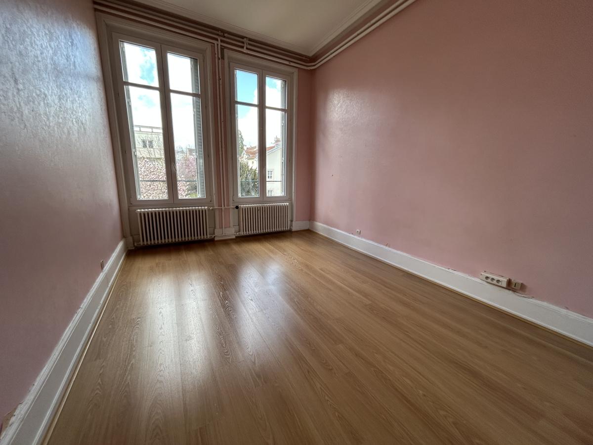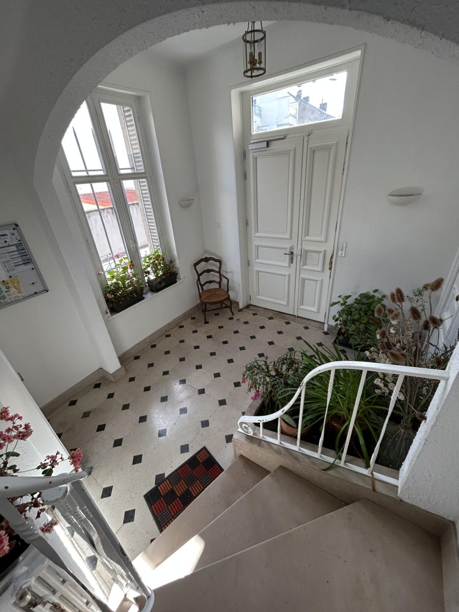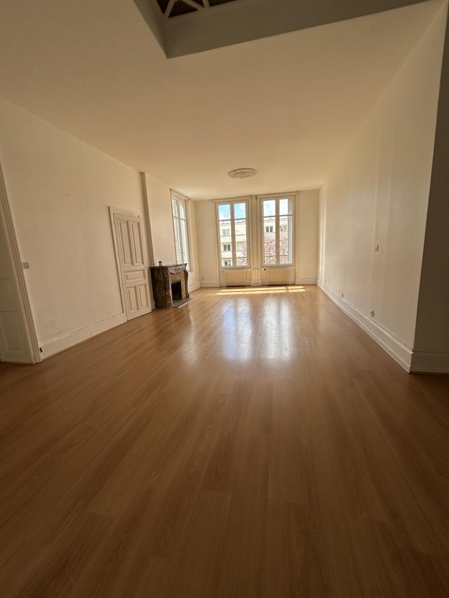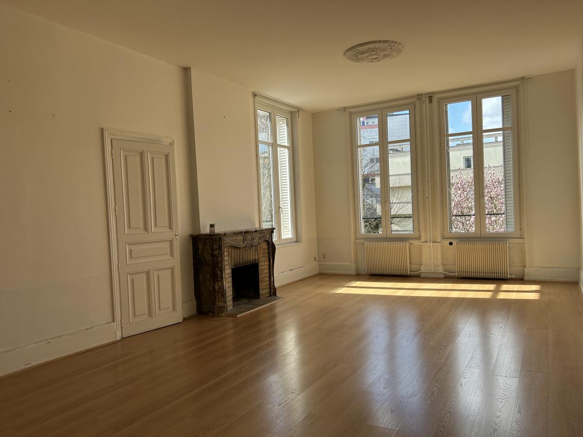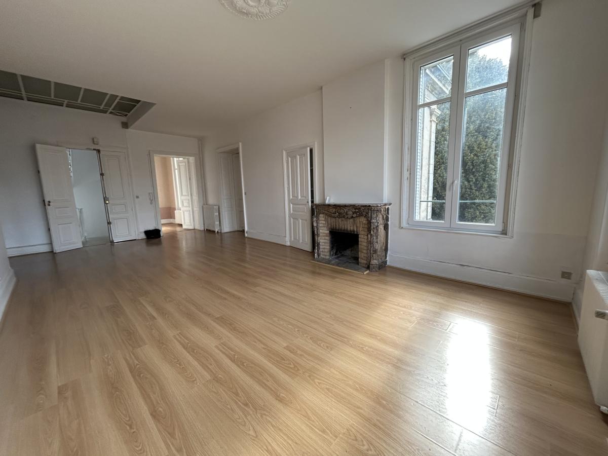 Dans un bel immeuble ancien (façades rénovées en 2010) comprenant 3 copropriétaires - Au 1er étage/2 - F5 de 116,58m² comprenant : séjour de 46m², bureau, cuisine non équipée, cellier, WC, salle de bains, 3 chambres, dégagement.