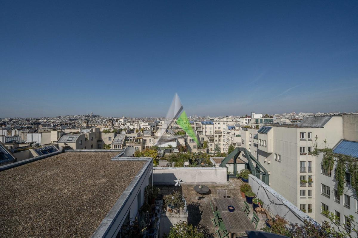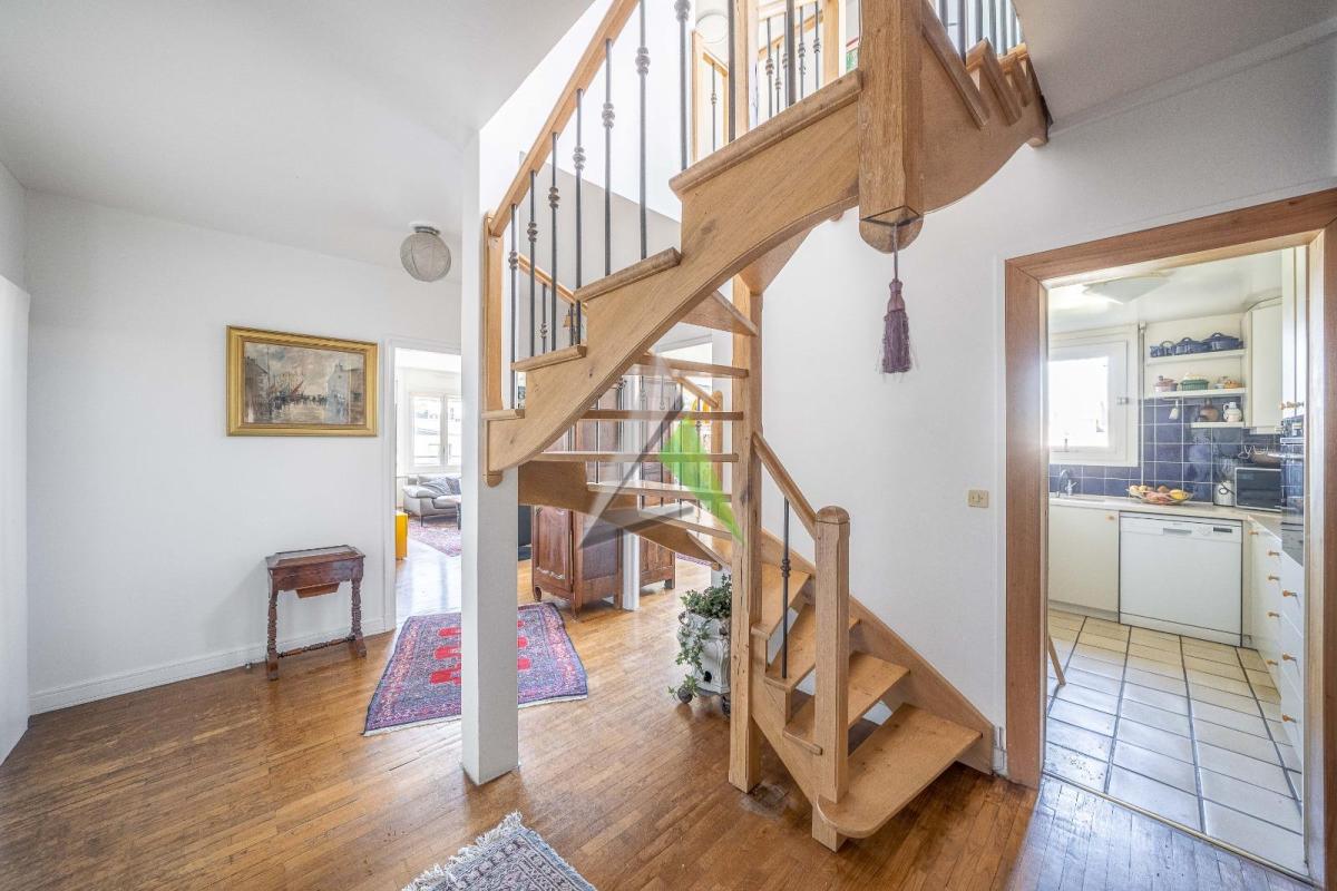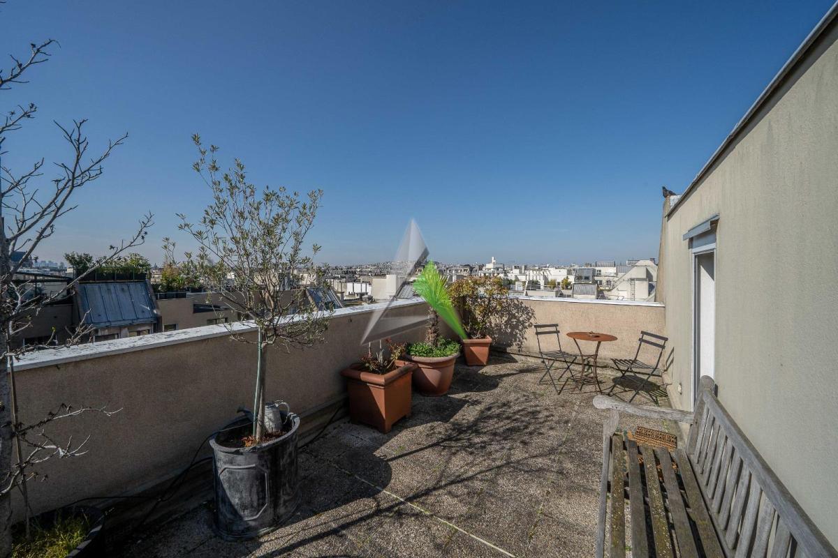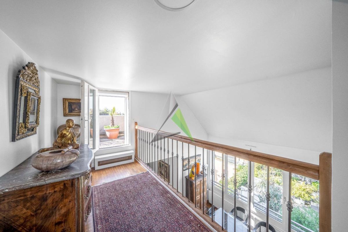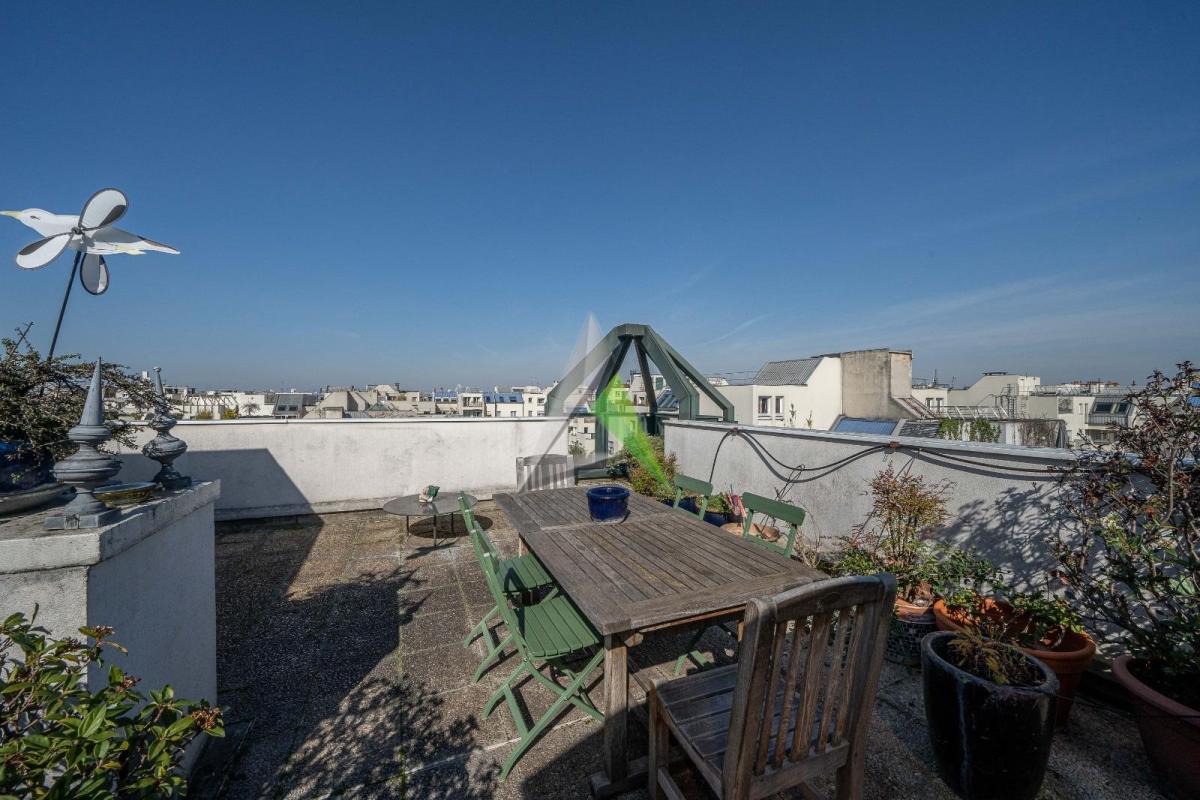 L'escalier en bois permet d'accéder à l'étage supérieur (8ème et dernier) où se situe la suite parentale avec sa salle de bains et l'accès aux terrasses qui se trouvent de part et d'autres du duplex, offrant un Rooftop avec une vue sur les toits parisiens et ses monuments.