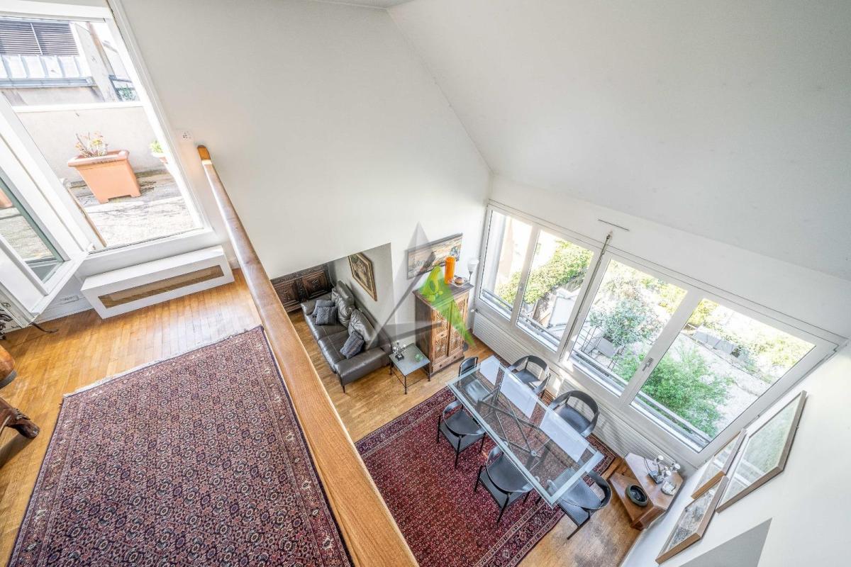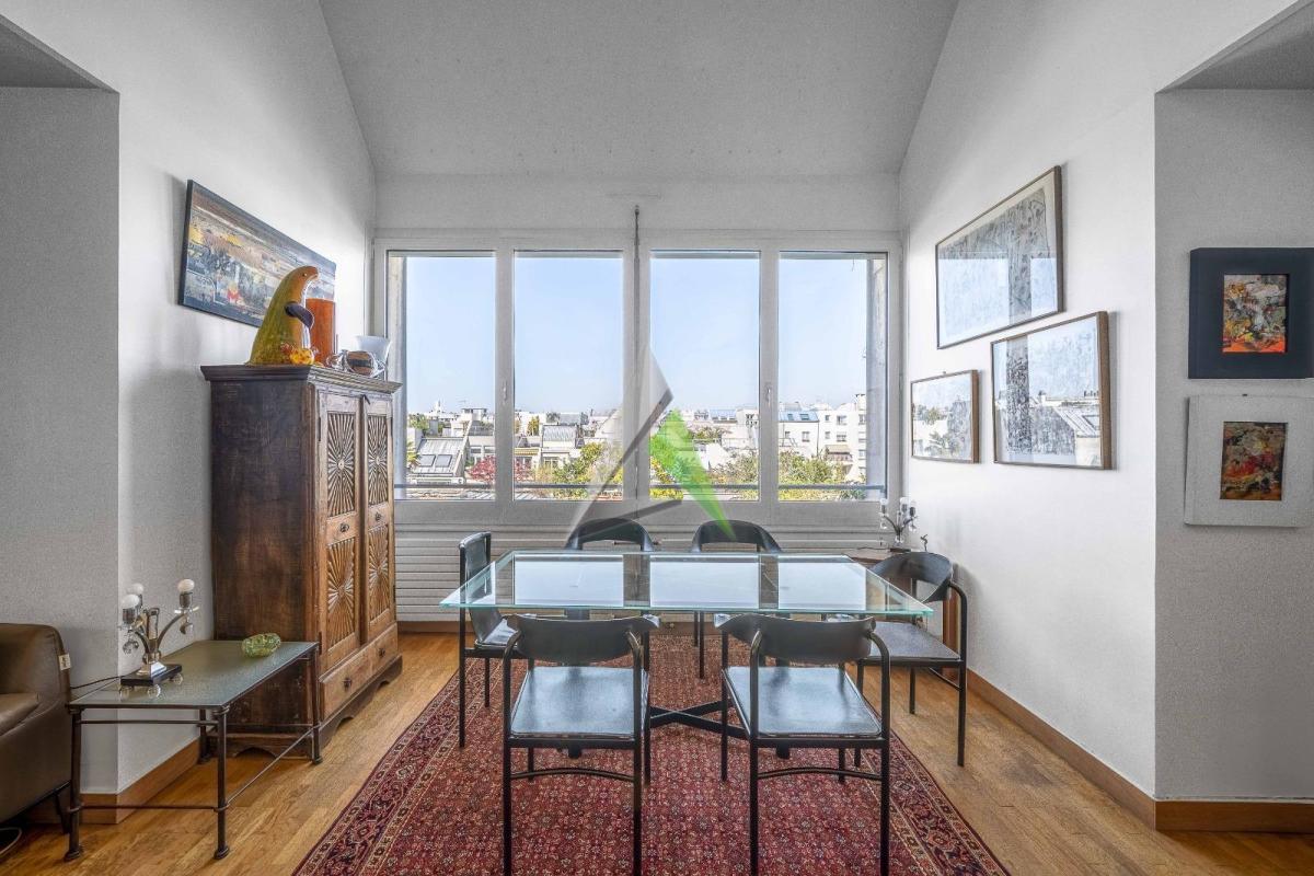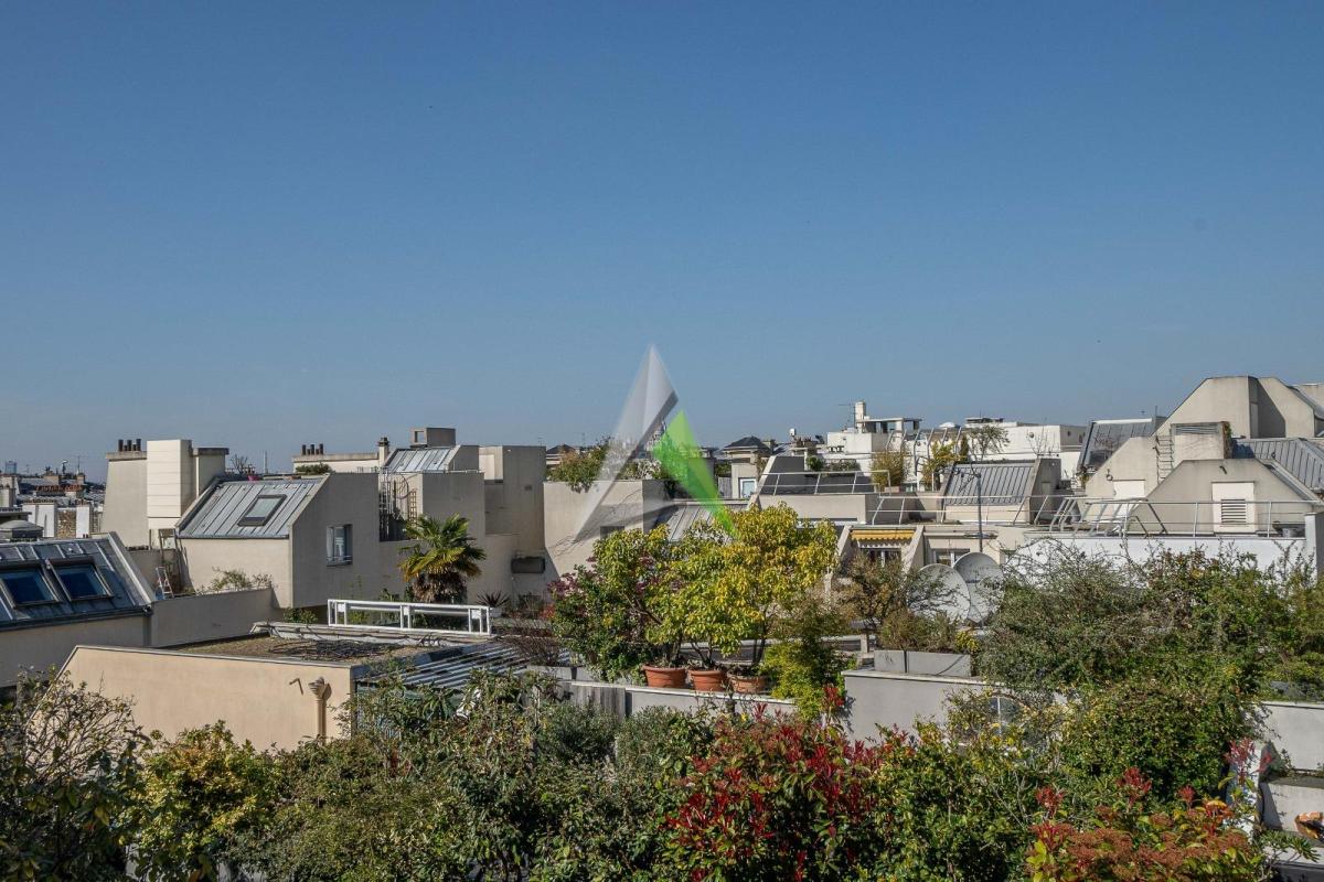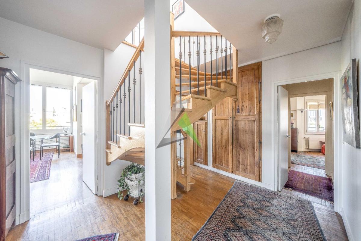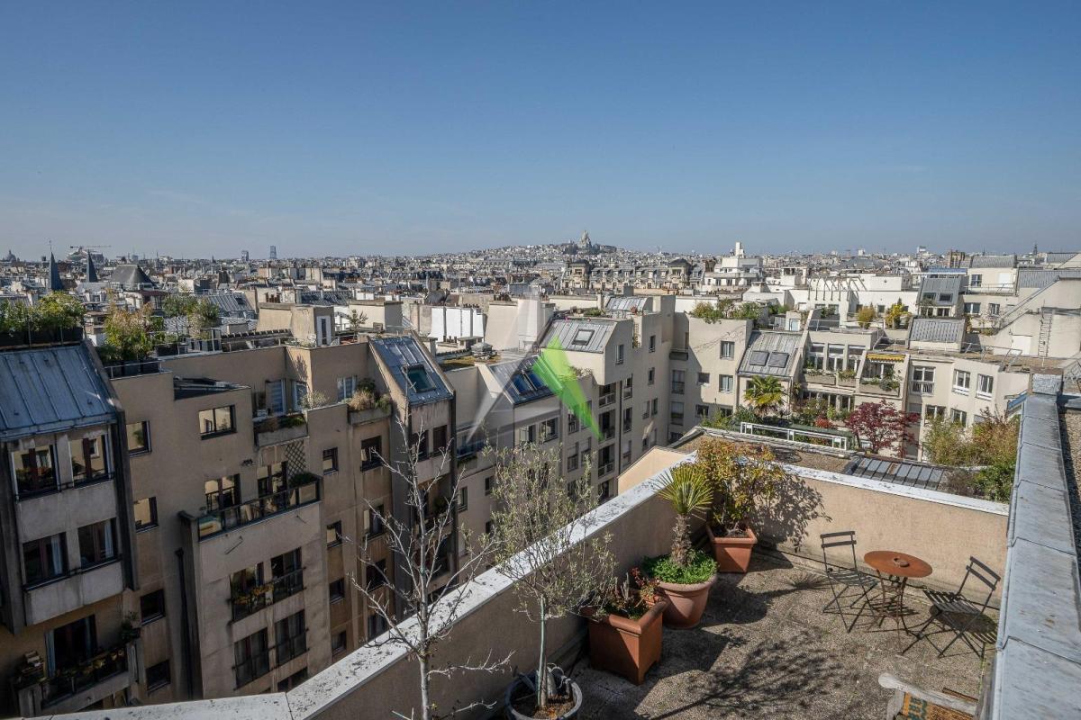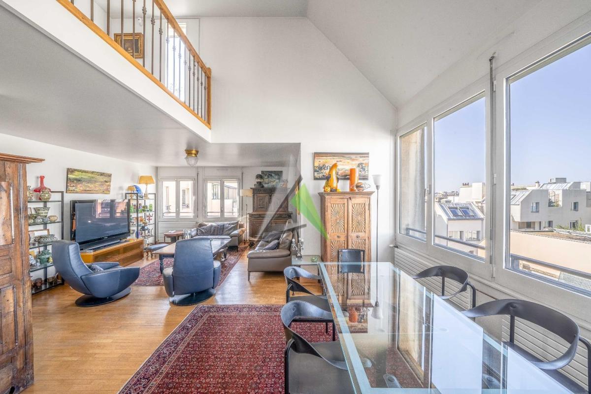 L'escalier en bois permet d'accéder à l'étage supérieur (8ème et dernier) où se situe la suite parentale avec sa salle de bains et l'accès aux terrasses qui se trouvent de part et d'autres du duplex, offrant un Rooftop avec une vue sur les toits parisiens et ses monuments.