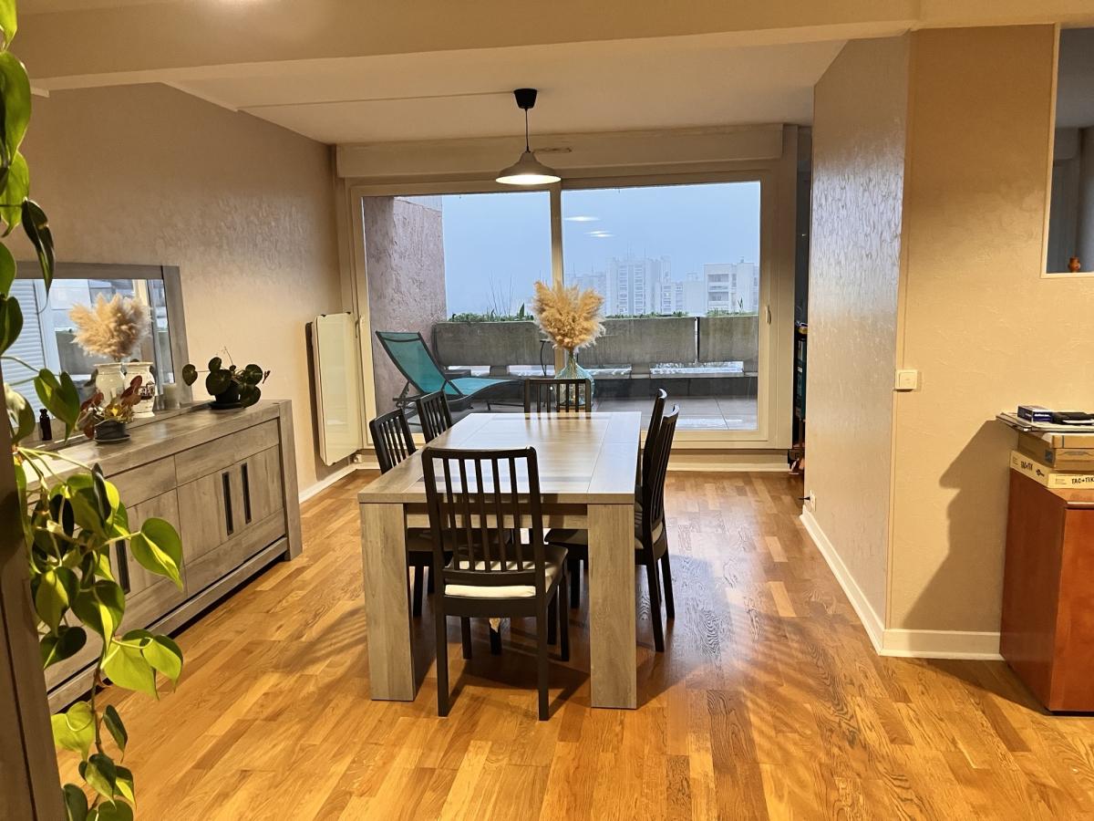 Entrée avec placards, séjour, salon, cuisine, deux chambres avec très grands rangements, un bureau donnant sur un grand balcon avec vue, deux salles d'eau, deux WC, dressing, lingerie, une grande terrasse.