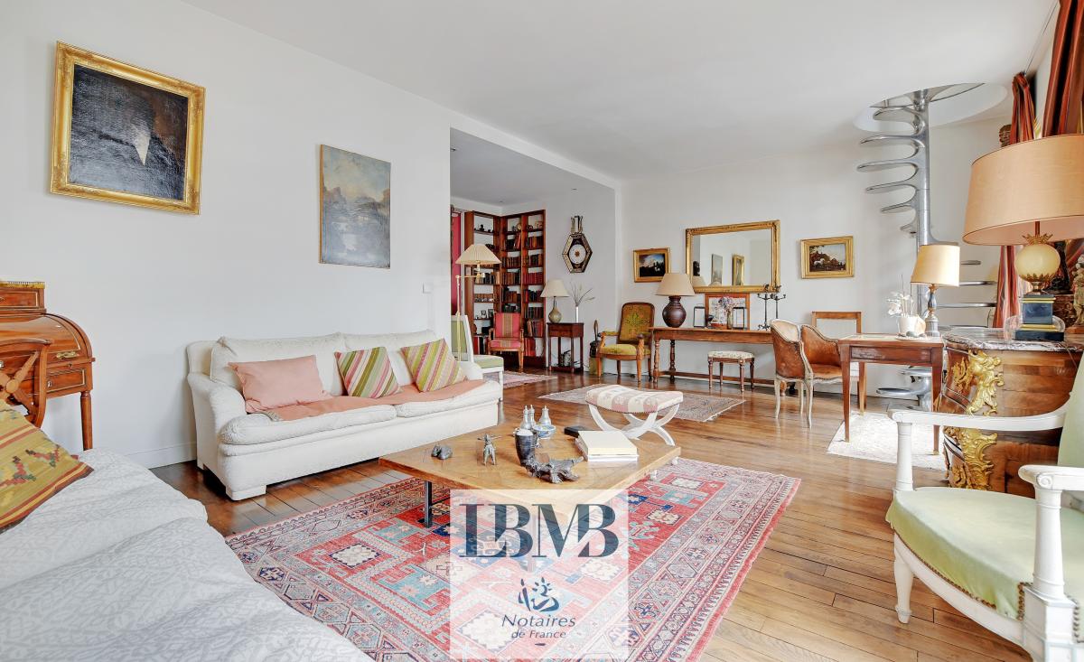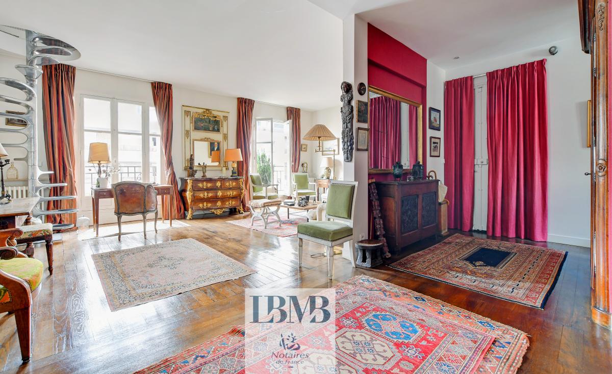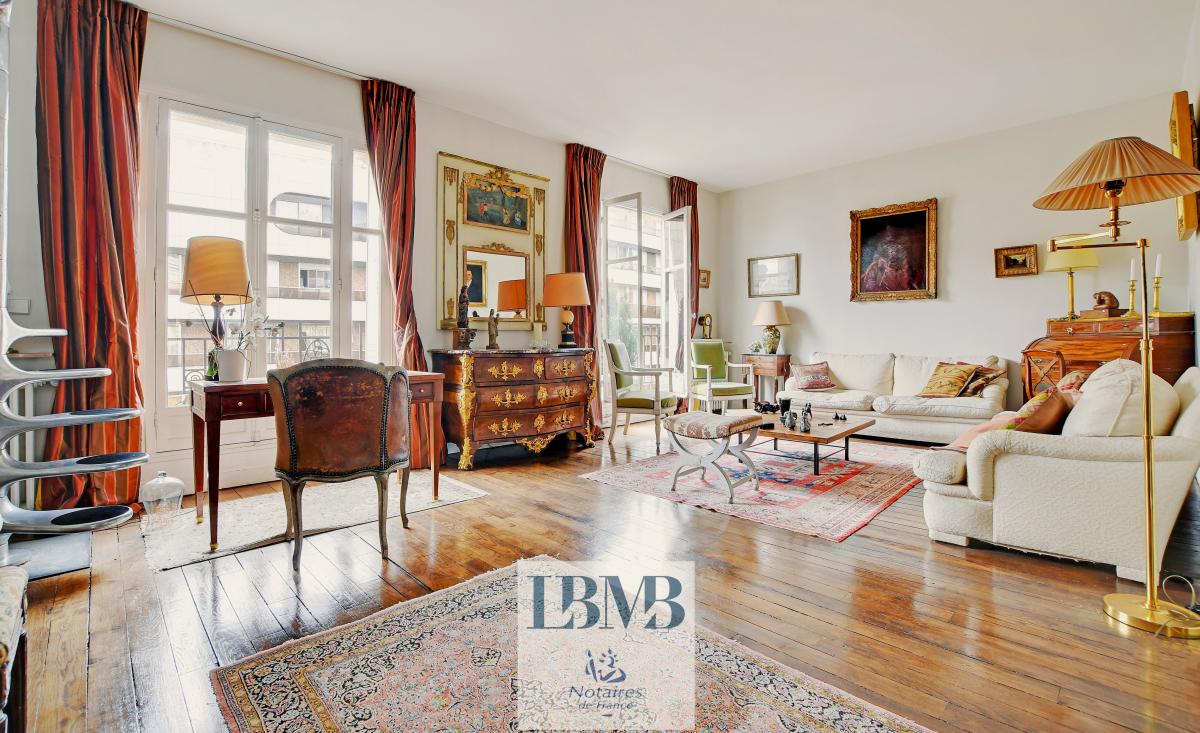 L'appartement-Duplex aux 5e et 6e étages, se compose d'une entrée avec placard distribuant un grand espace de réception avec balcon sur l'avenue exposé sud, une salle à manger ouvrant par double-porte sur le séjour sur cour, et un dégagement avec WC indépendant, une cuisine dinatoire prolongée d'une buanderie.