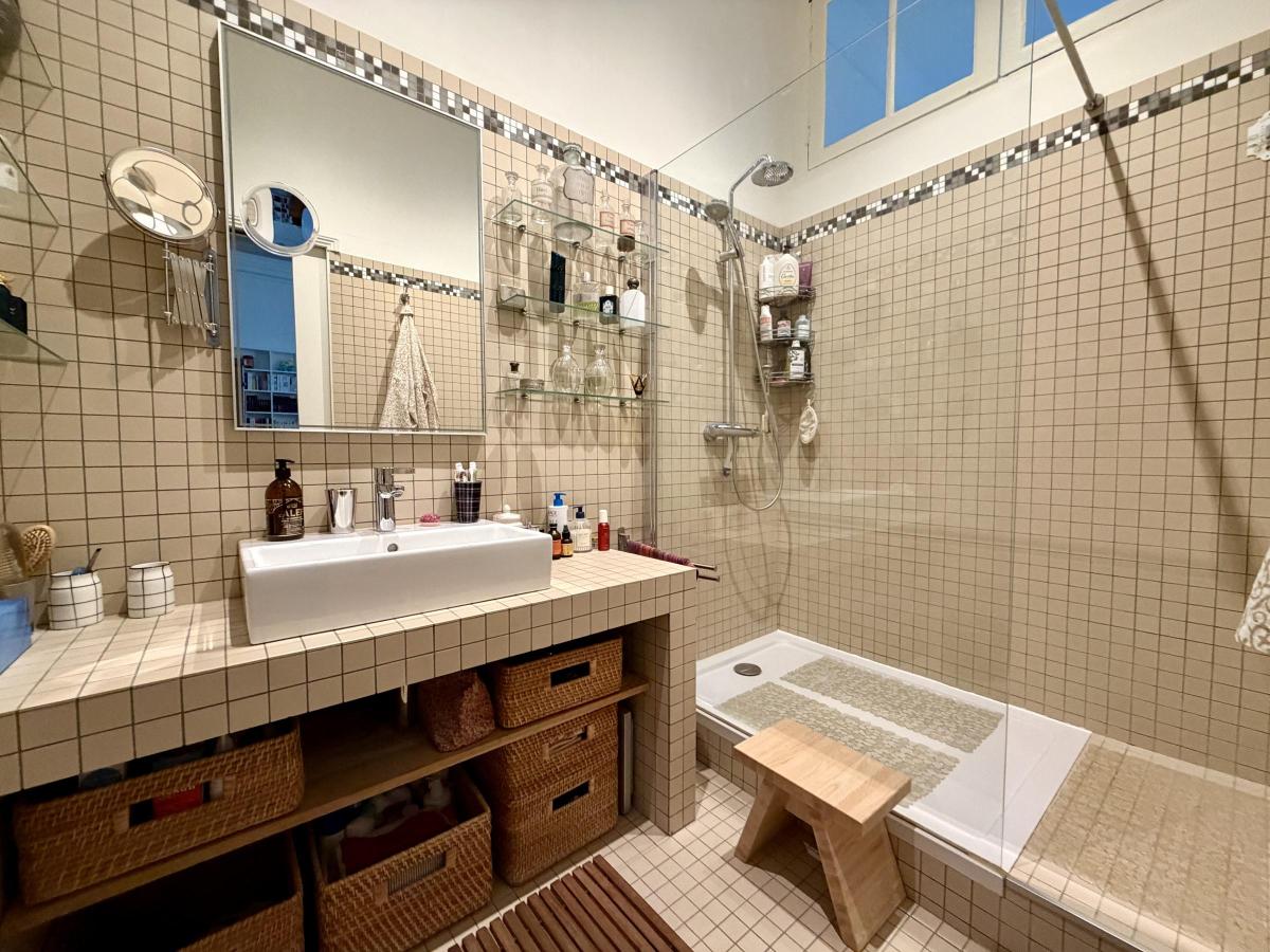 Une salle d'eau au style graphique et épuré, et un wc indépendant complètent ce bien d'exception.