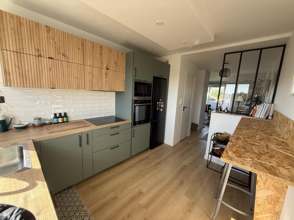 La cuisine aménagée est entièrement équipée. Les grandes baies dans les différentes pièces permettent d'avoir un ensoleillement toutes la journée.