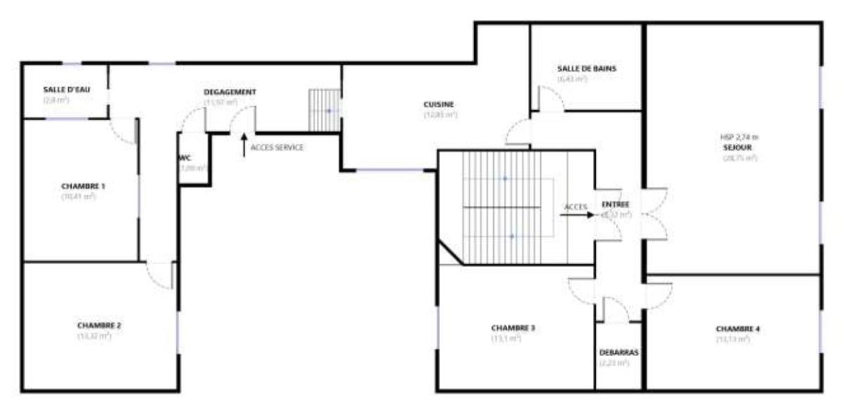 Il comprend une entrée, un double séjour sur rue, exposé sud ouest et sans vis à vis, une chambre sur rue, deux chambres sur cour, un bureau, une cuisine dinatoire, une salle de bains avec wc, une salle d'eau, un wc séparé.