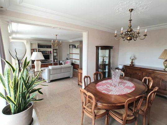 En centre-Ville, charmant Appartement 6 pièces d'env. 134m², au 4ème étage avec ascenseur d'une résidence bien entretenue offrant une belle vue dégagée : Entrée, double Séjour, Cuisine intégralement équipée, Cellier-Buanderie, 4 belles chambres, 2 Salles d'Eau dont 1 avec WC et WC indépendant + Terrasse carrelée plein SUD d'env. 27m².