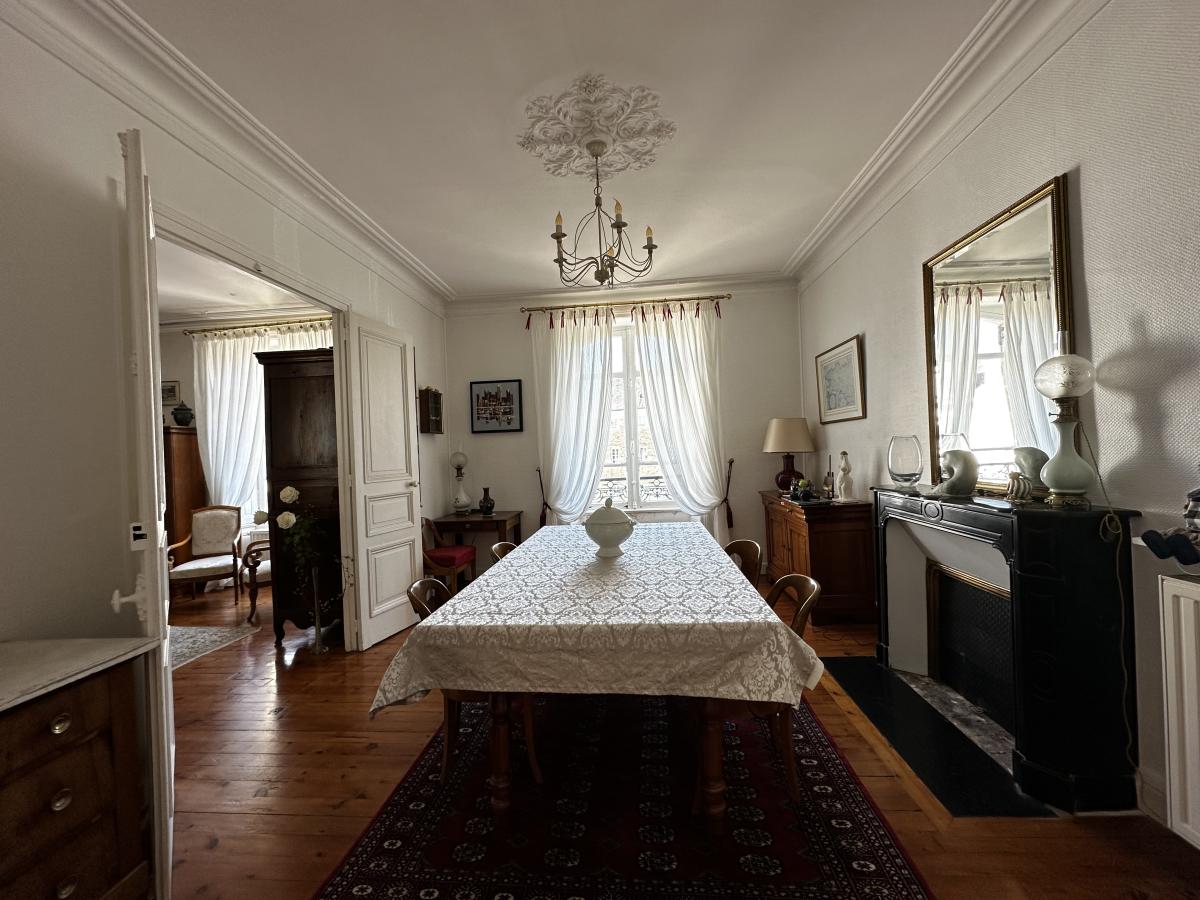 A VENDRE 56 : VANNES CENTRE VILLE : TRES BEL APPARTEMENT 2EME ETAGE SANS AS. EXP. E/O, EN DUPLEX : 1ER NIVEAU : entrée, salle à manger/parquet/cheminée, très beau salon sur parquet/cheminée, cuisine aménagée-équipée, arrière-cuisine, wc/lave-mains, 1 belle chambre/parquet, salle d'eau - 2ME NIVEAU : palier-mezzanine lumineux sur parquet desservant : bureau/parquet/cheminée, wc, salle de bains/parquet (2 vasques, baignoire et douche), bureau/parquet/placard, 1 belle chambre/parquet, 1 pièce "atelier" ou chambre sur parquet/cheminée - AU-DESSUS : grenier 1 CAVE - 1 BOX FERME -