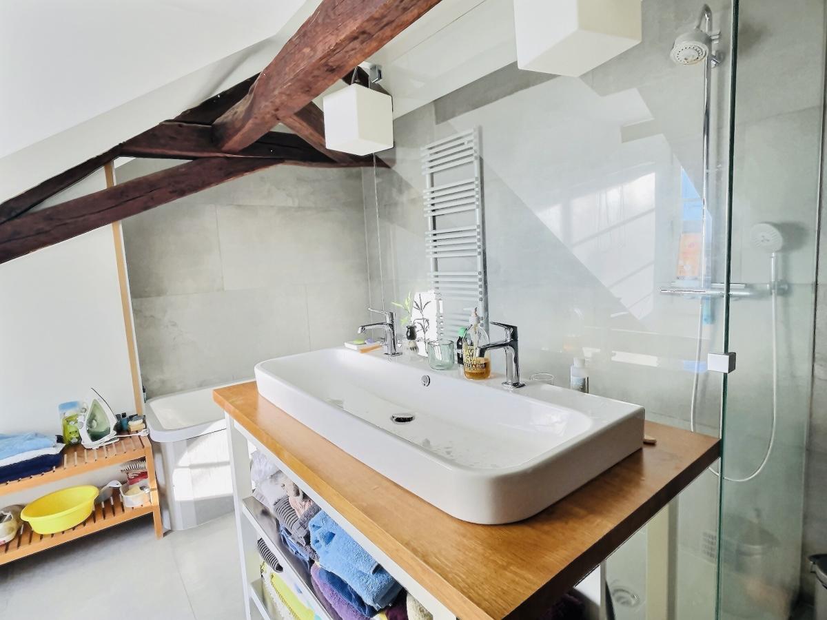 Au deuxième niveau: un espace de vie avec verrière, trois chambres, une salle de bains avec douche et wc,