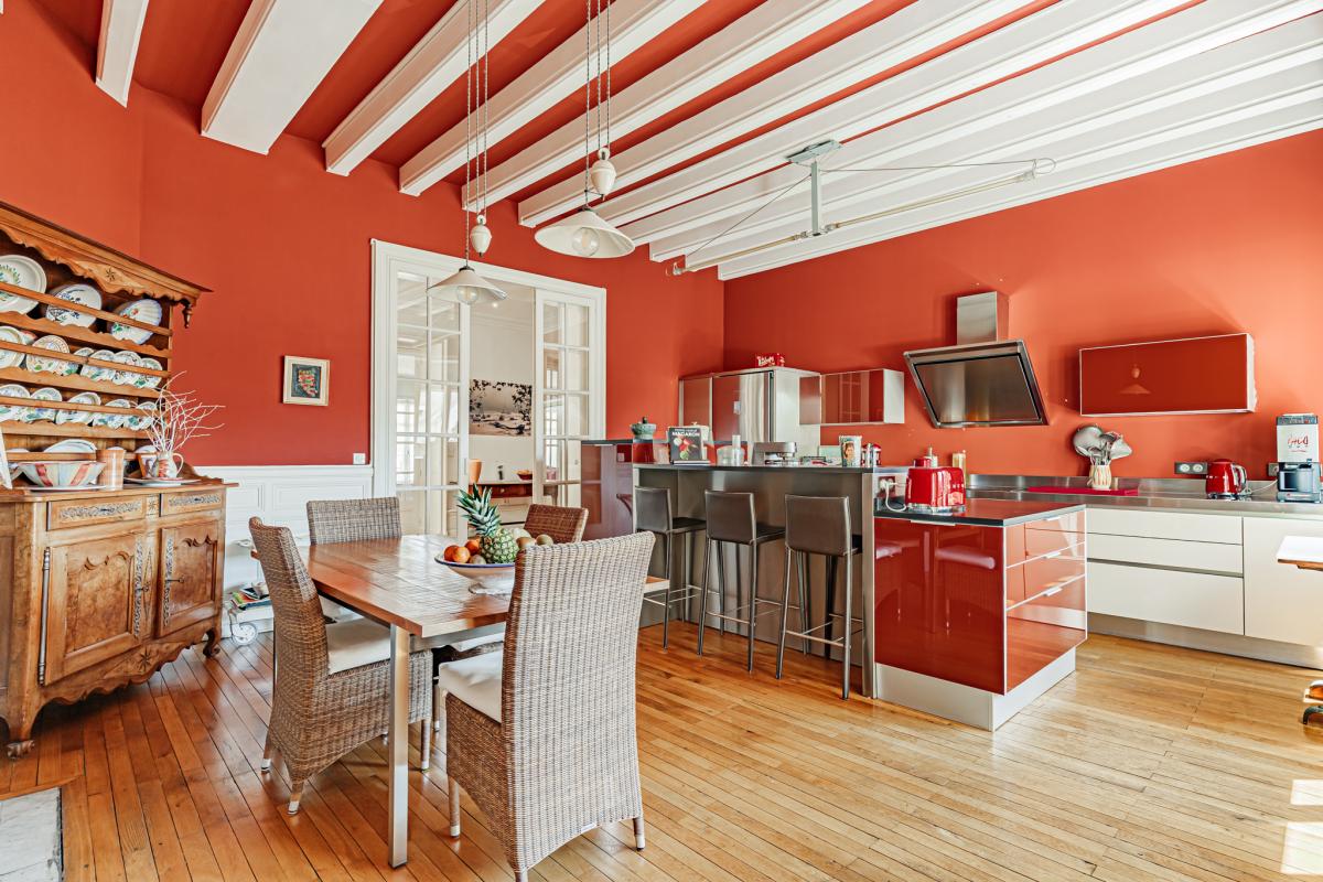 Entrée , vastes dégagements , belle cuisine équipée avec espace repas, grande salle à manger- salon cheminée , bureau