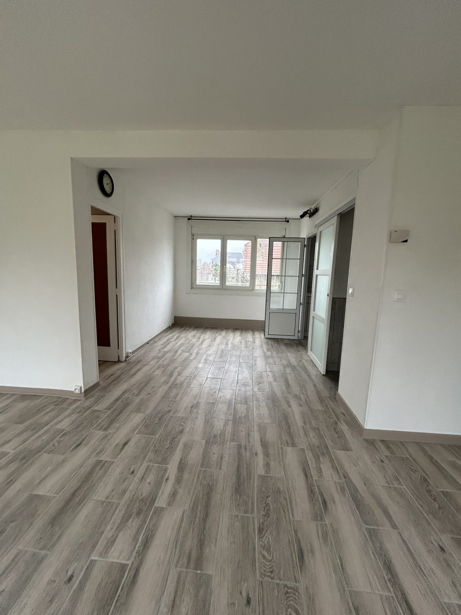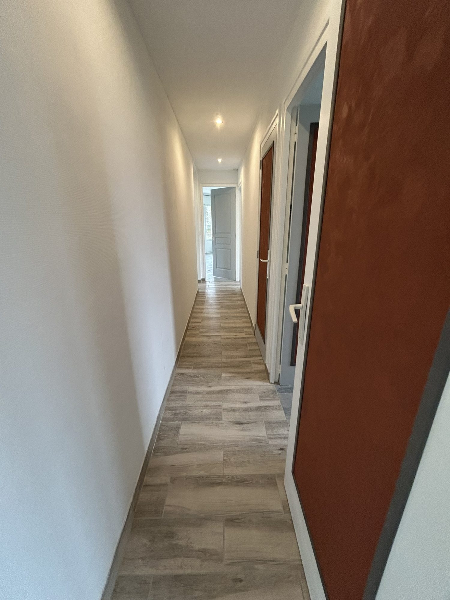 Entrée avec vestiaire, cuisine équipée, grand séjour salon (agrandi avec une chambre), couloir, deux chambres dont une double, bureau ou chambre bébé avec cabinet de toilette, salle d'eau, wc.