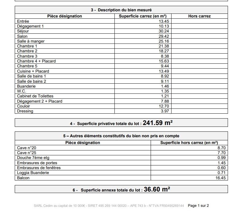 On the 6th and top floor of a distinguished and elegant stone building with high-quality finishes, featuring an elevator that stops on the 5th floor and a concierge, discover this beautiful family and reception apartment of 241.59 m² (Carrez law) in need of renovation. Boasting a generous ceiling height of 3 meters, exceptional natural light, and beautiful original features, it opens onto an elegant entrance gallery leading to two large living rooms extended by a wide 16.45 m² balcony. It also includes a dining room, a separate kitchen, 3 to 4 bedrooms, a study, two bathrooms (one with a WC), ample storage, and separate toilets.