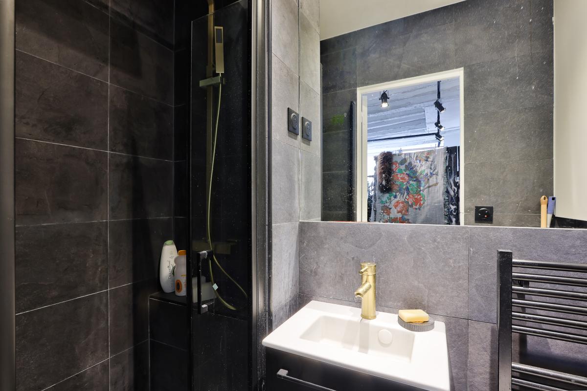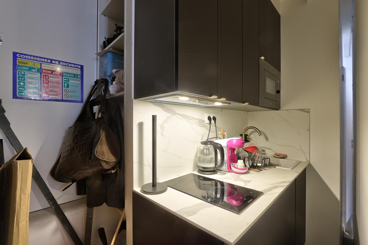 Dissimulés à l'arrière de la boutique, une cuisine équipée avec rangements et une salle de douche avec toilettes.