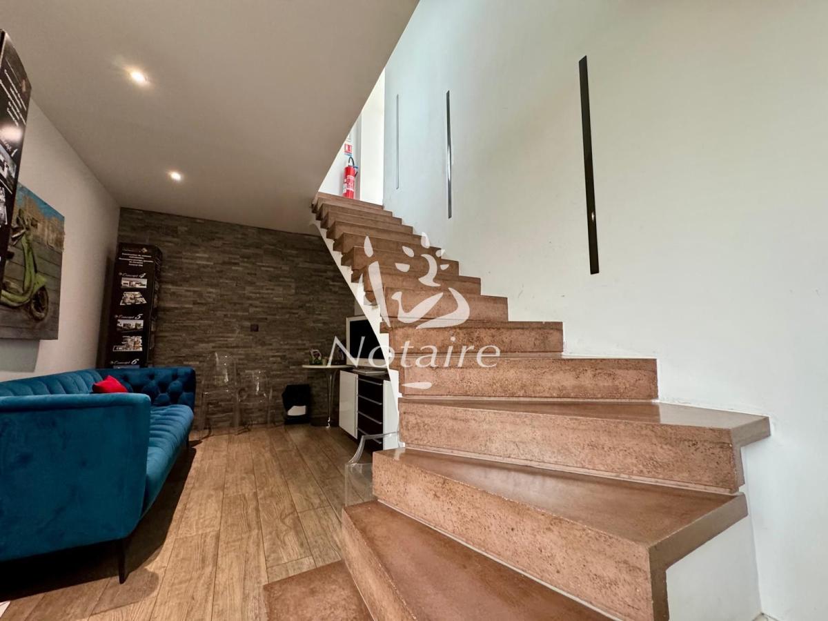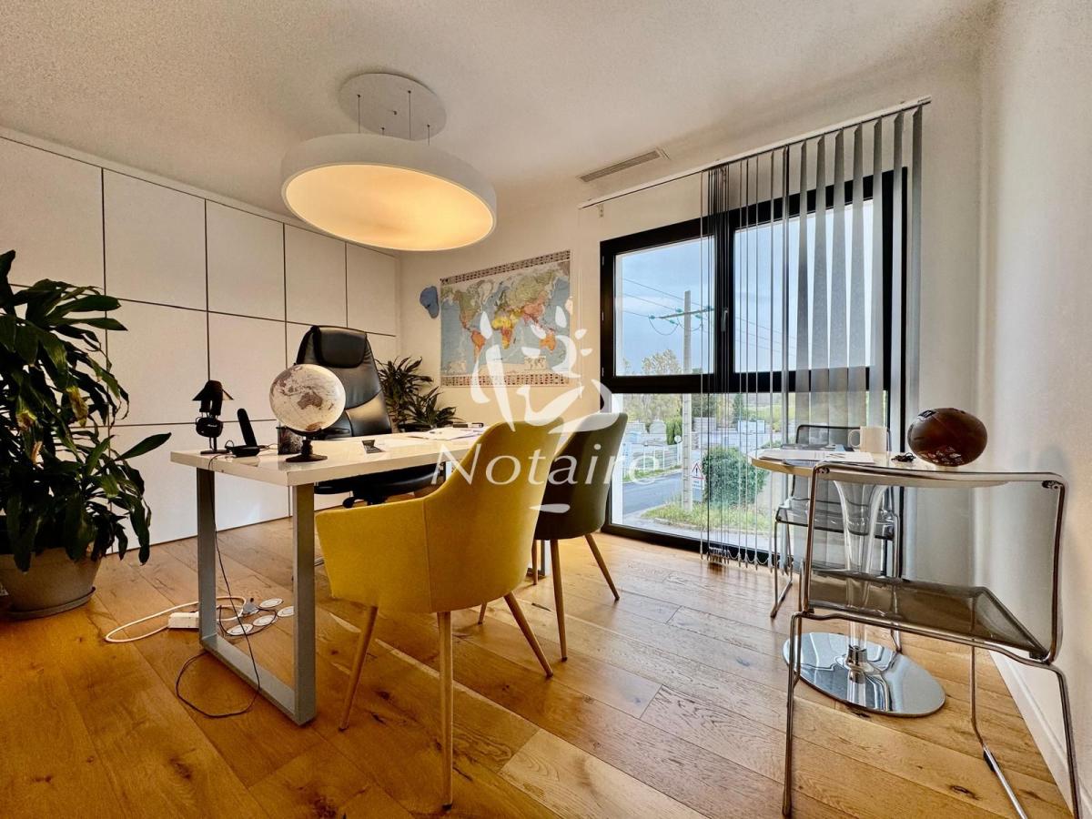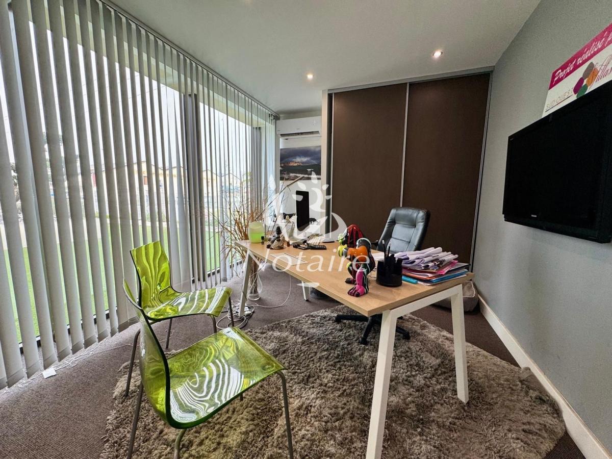 - Au premier étage : D'un second espace ouvert (salle de réunion ou espace coworking), de sept bureaux modernes et d'un WC. Il est à noter que la conception du bâtiment permet la création d'un appartement T2 en regroupant trois bureaux (la porte d'entrée et la séparation sont déjà prévues).