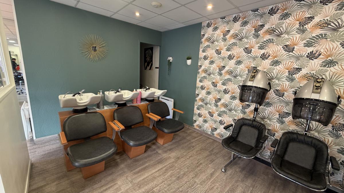Au rez-de-chaussée : salon de coiffure mixte avec trois places champoings et 5 places technique coupe, réserve avec WC.
