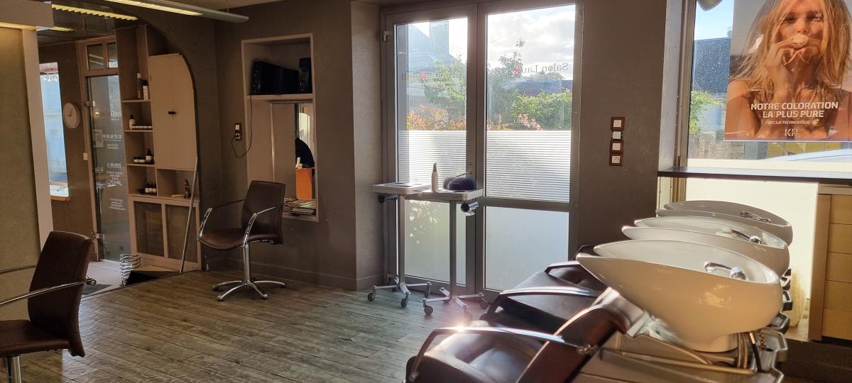 Aménagement actuel : espace d’accueil, postes de coiffure, zone technique et réserves