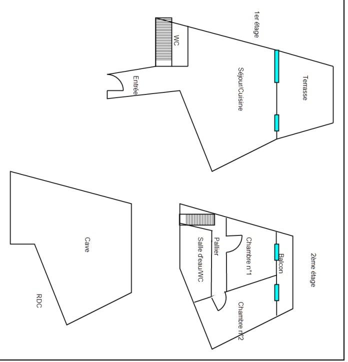 composé au premier d'un séjour cuisine 19.50m², une salle d'eau avec wc et à l'étage deux chambres.