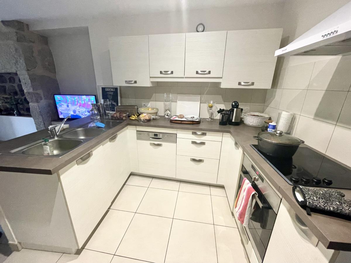 Séjour ouvert sur cuisine entièrement équipée, plan de travail, lave vaisselle Bosch, four pyrolyse Brandt, plaques électriques 4 feux, hotte aspirante.