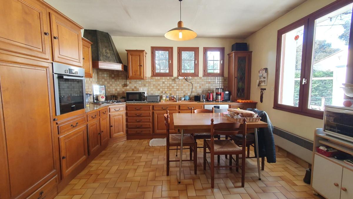 La maison se compose d'un grand salon-séjour avec cheminée ,qui se prolonge par une terrasse exposée au sud, d'une cuisine aménagée et équipée. Le coin nuit offre deux chambres et un bureau, une salle de bains. Une salle d'eau avec coin buanderie, et des toilettes complètent la partie habitation. S'y ajoutent également un garage, un carport et un cabanon. Beau potentiel avec des travaux à prévoir.