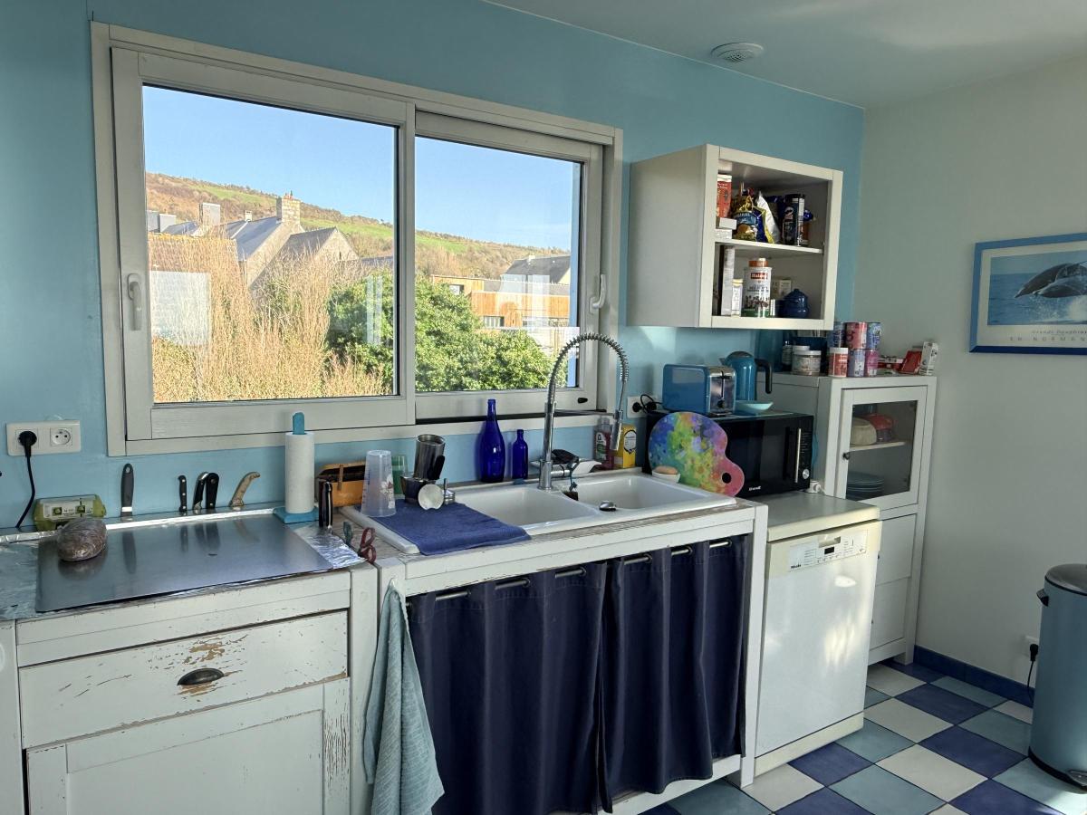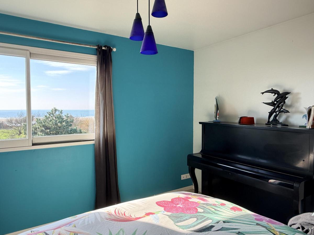 - à l'étage, offrant une vue imprenable sur la mer: le séjour-salon avec poêle à bois baigné de lumière grâce aux grandes baies inondant cet espace familial ouvert sur la cuisine et la salle à manger. Une cinquième chambre et une terrasse sur pilotis de laquelle la vue est à couper le souffle complètent ce niveau ! Autre WC à cet étage.