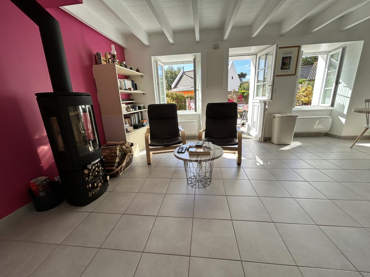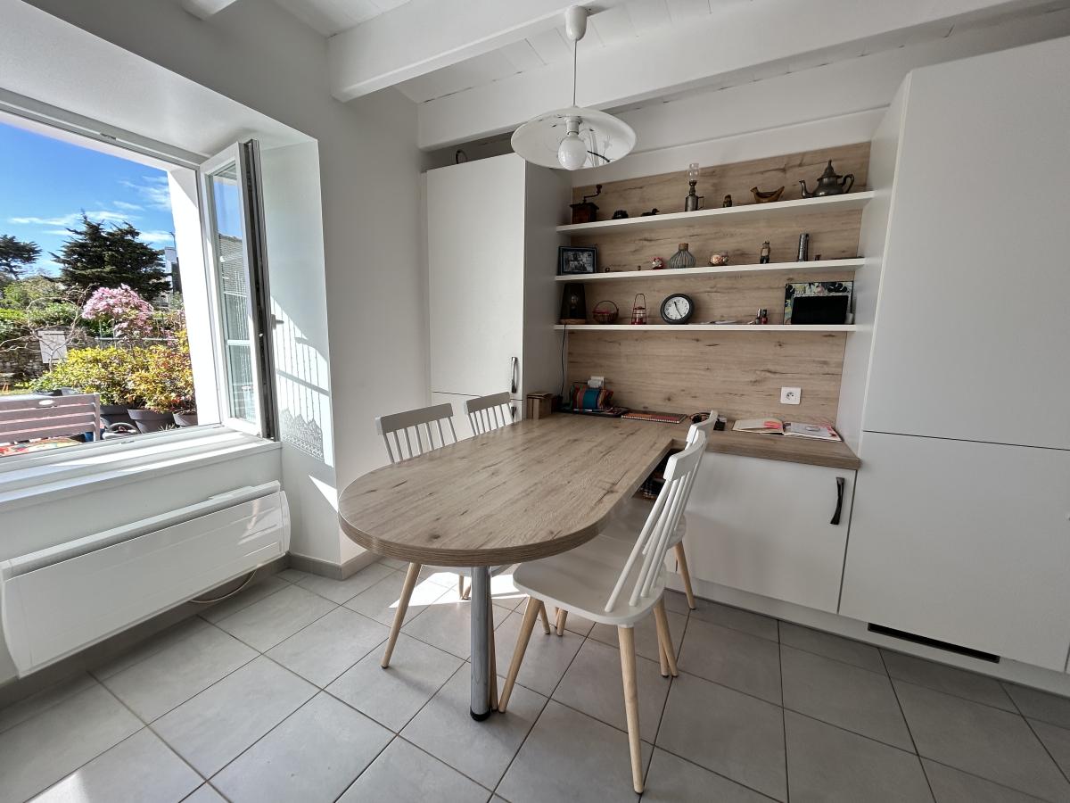 BELLE ILE EN MER - Située à quelques minutes à pied des sentiers côtiers et de la plage de Pouldon, maison mitoyenne de part et d'autre, d'environ 63 m² habitables comprenant au rez-de-chaussée: séjour avec poêle à bois et cuisine ouverte , au 1er étage: palier desservant chambre et salle d’eau avec W.C, au 2ème étage sous comble: chambre. Dépendance en pierres d'environ 40m² comprenant: salon, salle d'eau avec W.C. cuisine en appentis, et une chambre à l'étage. Garage en pierres. Jardin et terrasse. Assinissement et compteurs communs à la maison et la dépendance. LOCMARIA