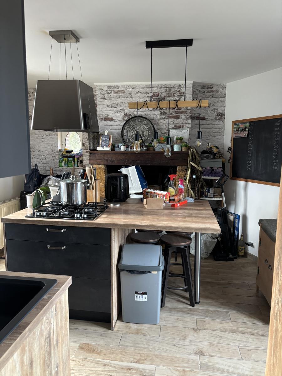 - Au rez-de-chaussée : Entrée, séjour avec poêle à bois, cuisine aménagée et équipée avec ilot central, wc.