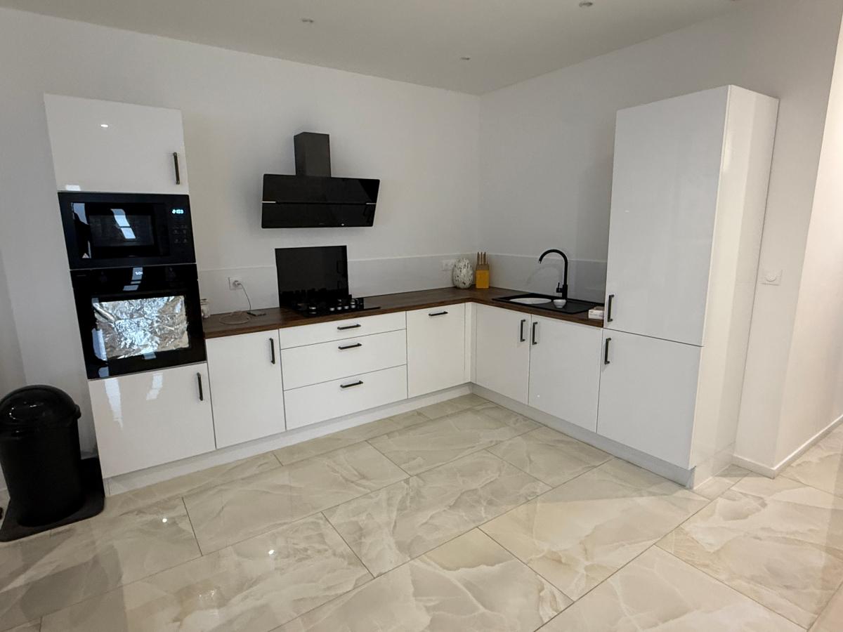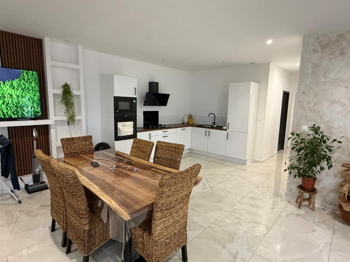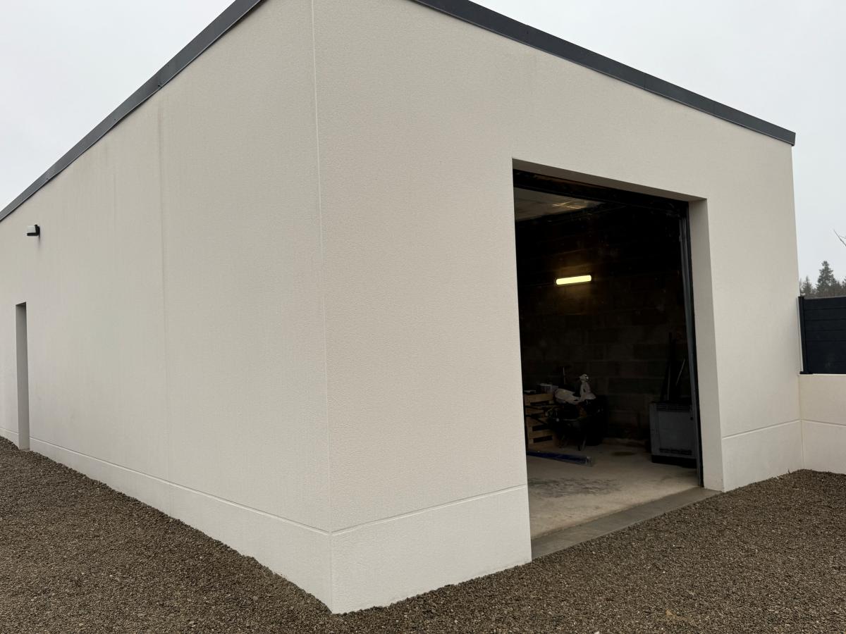 BONCHAMP LES LAVAL, Maison de plain-pied comprenant pièce de vie avec cuisine ouverte aménagée et équipée, 3 chambres, salle de bains (baignoire et douche). Dépendance : garage de 65m² avec douche et w-c. Terrain clos de 909m².